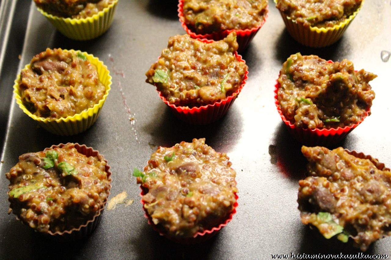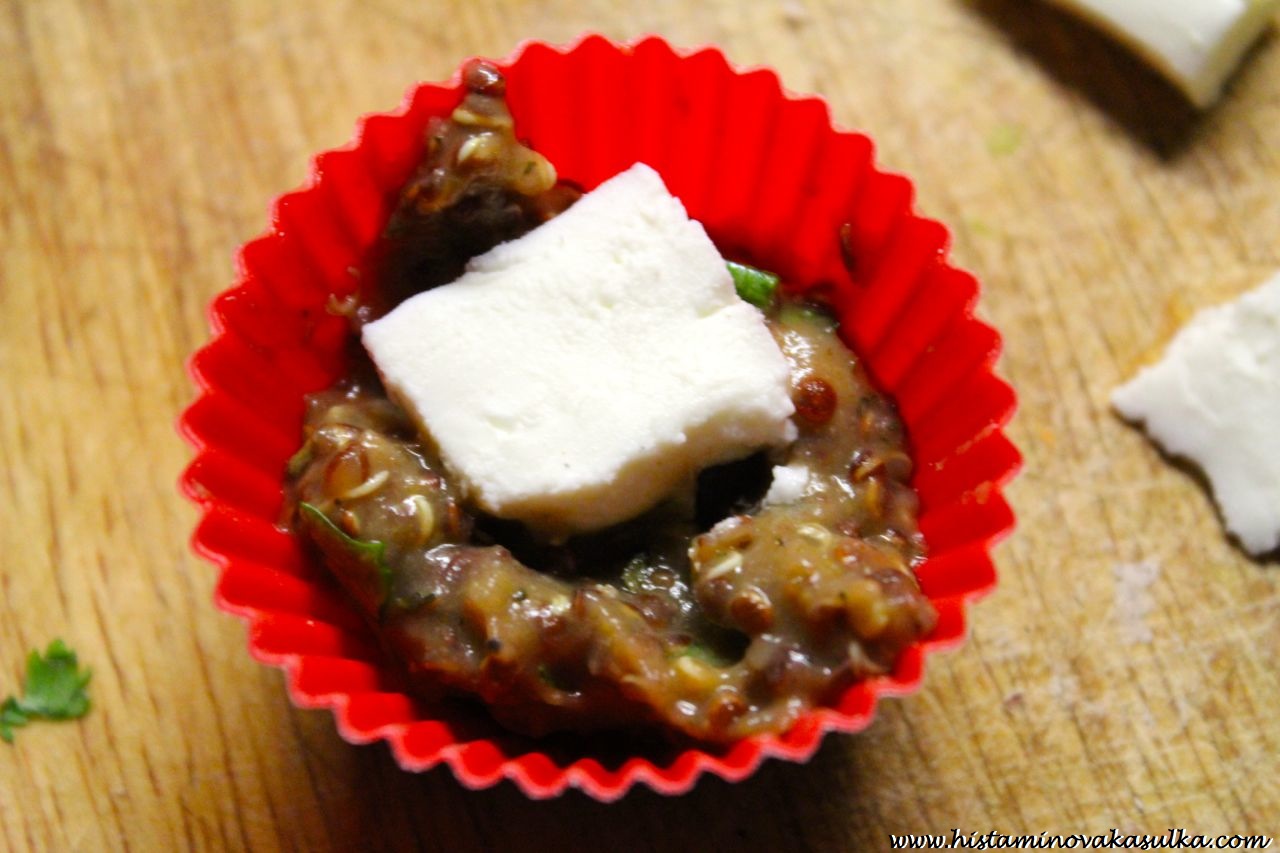 Vše dobře promícháme a plníme do malých mufinových košíčků (nebo zvolených formiček). Já jsem naplnila do půlky, vložila kousek balkánského sýru a pak doplnila košíčku až po vrch.