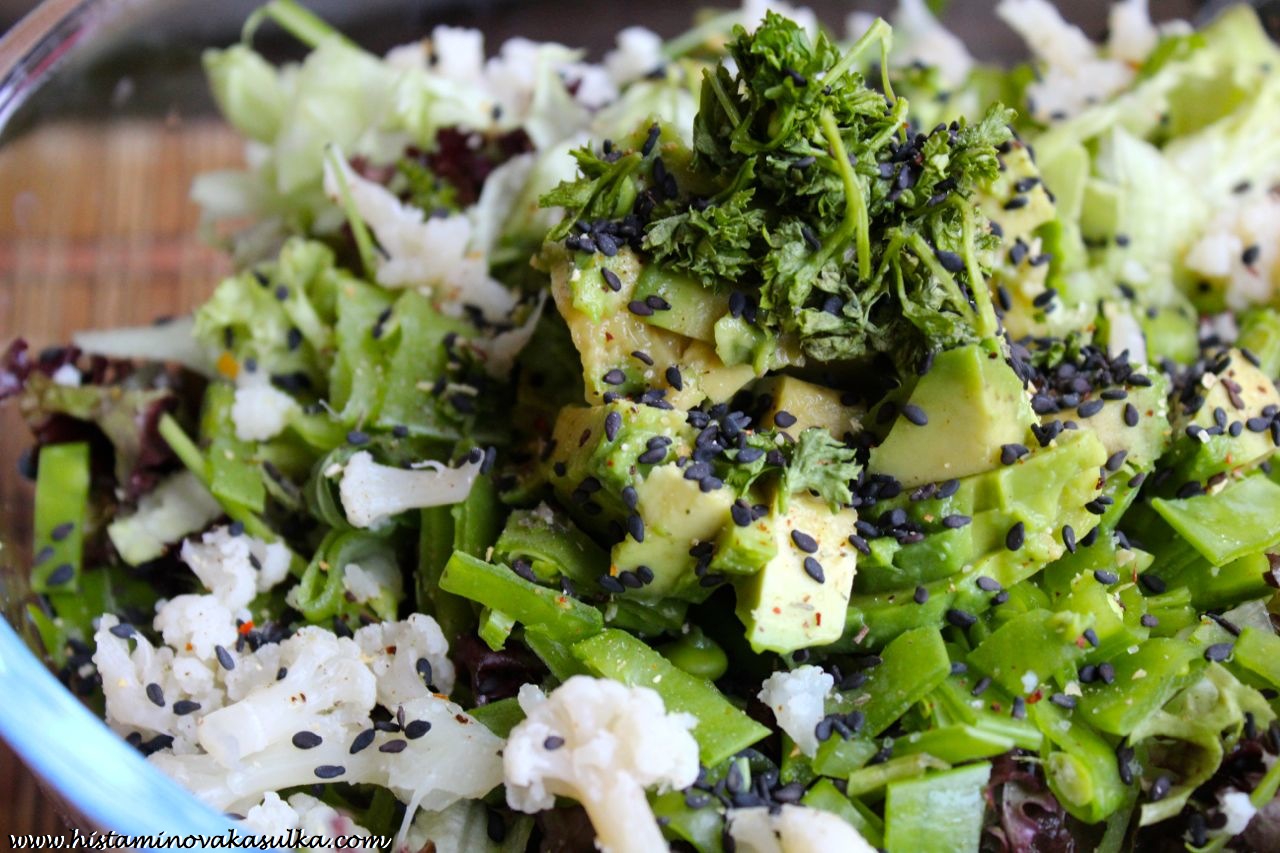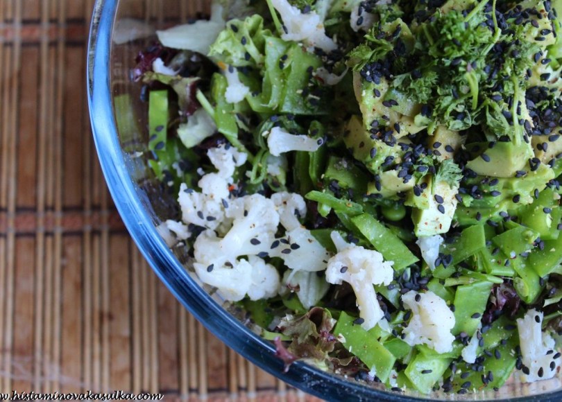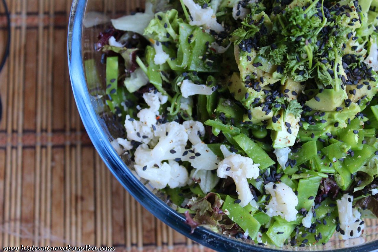 Je tu jaro, venku krásně, nabídka čerstvého ovozelu (ovoce+zeleniny) se nám rozšiřuje. Proč nevyzkoušet něco tak trochu netradičního? Třeba spojení mladého hrášku, který všichni dobře známe, ale většinou nás nenapadne jíst celé lusky (přitom ty obsahují spoustu chlorofylu, který nám dělá vyloženě dobře), s exotickým avokádem a vařeným květákem? Delikatesní. Přisypte trochu semínek, přikápněte konopný olej a užívejte si extra dávku vitamínů, minerálů, protizánětlivých omega-3 mastných kyselin a nálož vlákniny!