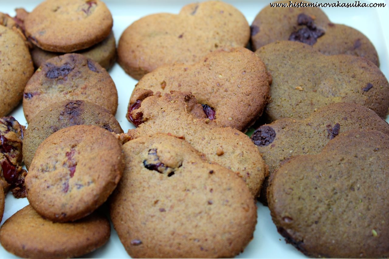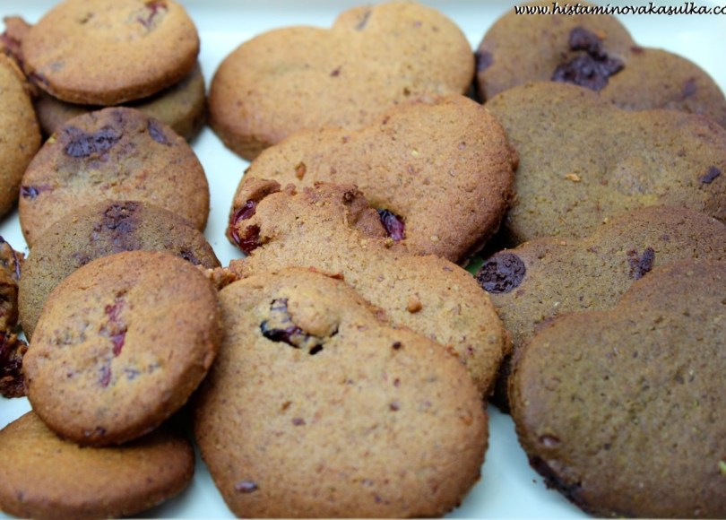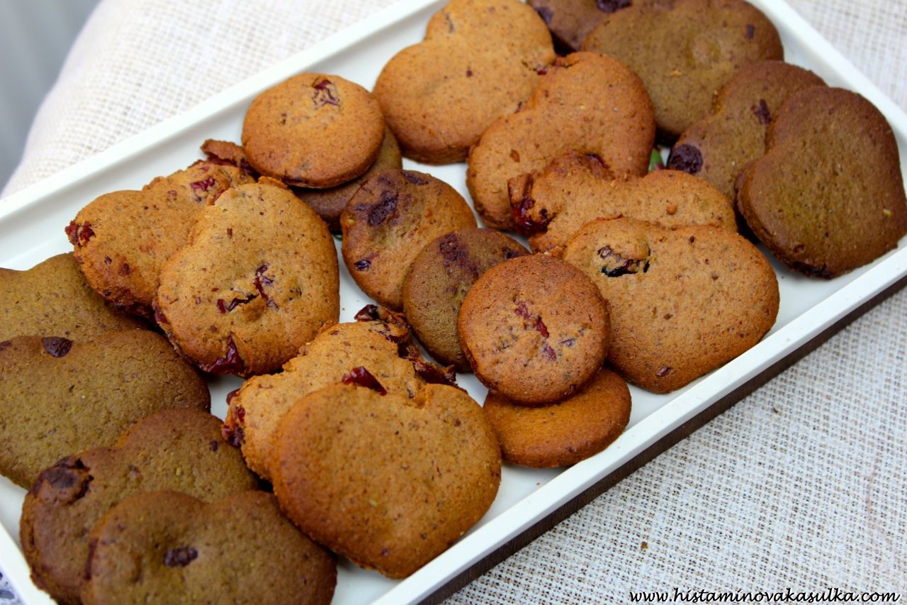 Přišel čas výletování a co si budeme povídat – vozit sebou bábovku na zádech je pěkná pruda. Pak někde vyloupnete tu svou mističku, ze které vyberete rozemletou bábovku a snažíte se ostatní přesvědčit, že je to vážně moc dobré. A tak tradičně nastal čas sušenek. I když tyto sušenky oceníte spíše k čaji, jsou pevné, tvrdší (než cookies), prostě odolné. Tedy když je dobře zabalíte a necháte pár dní odležet, trochu změknou. Připomínají mi sušenky podávané k čaji nebo kakau, které si namáčíte a ukusujete. Rozhodla jsem se trochu čaje přisypat i dovnitř. Teda řeknu vám, kombinace máslové chuti, matcha čaje a ideálně čoko kousků je naprosto skvělá. Ale i verze bez čaje se sušenými brusinkami není k zahození:)