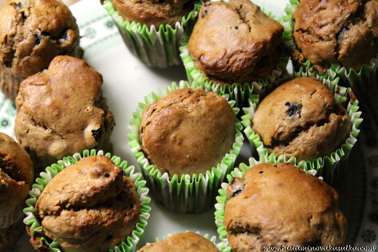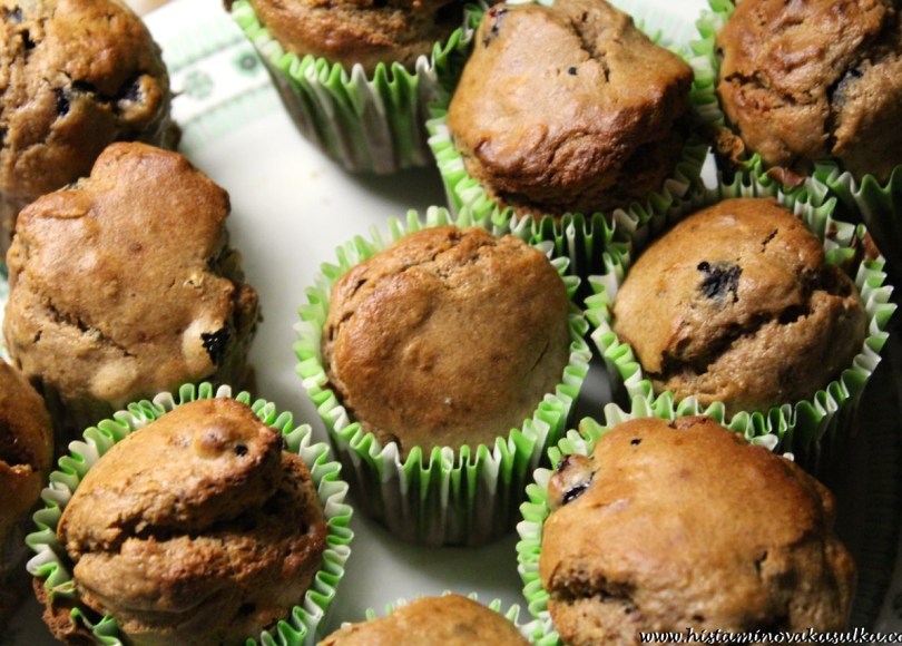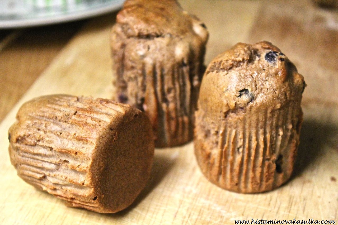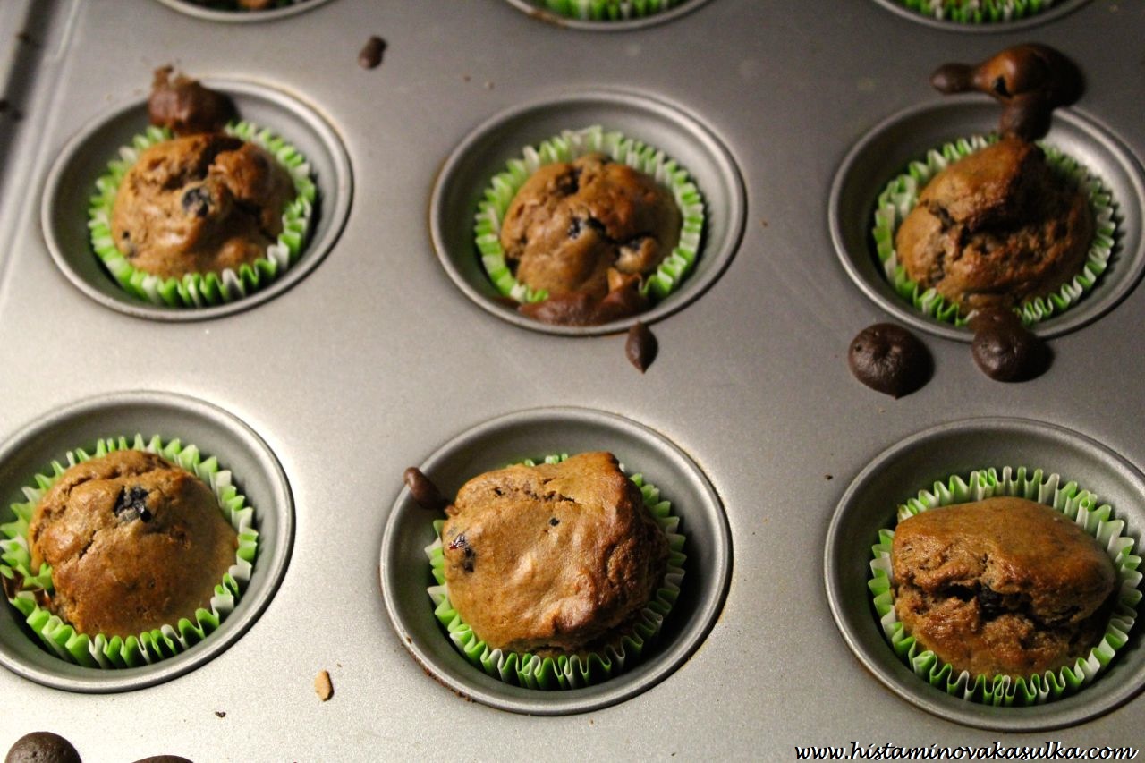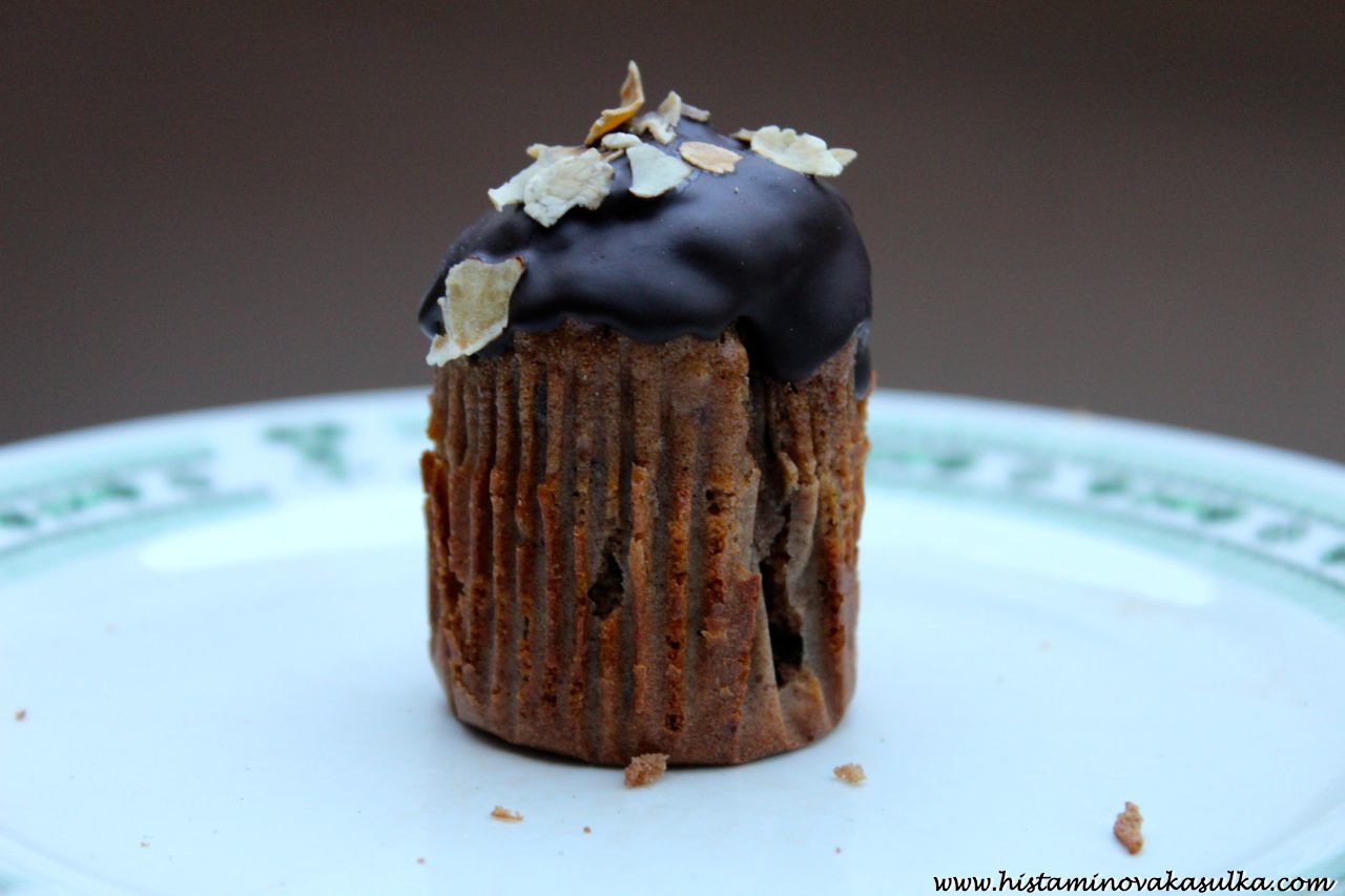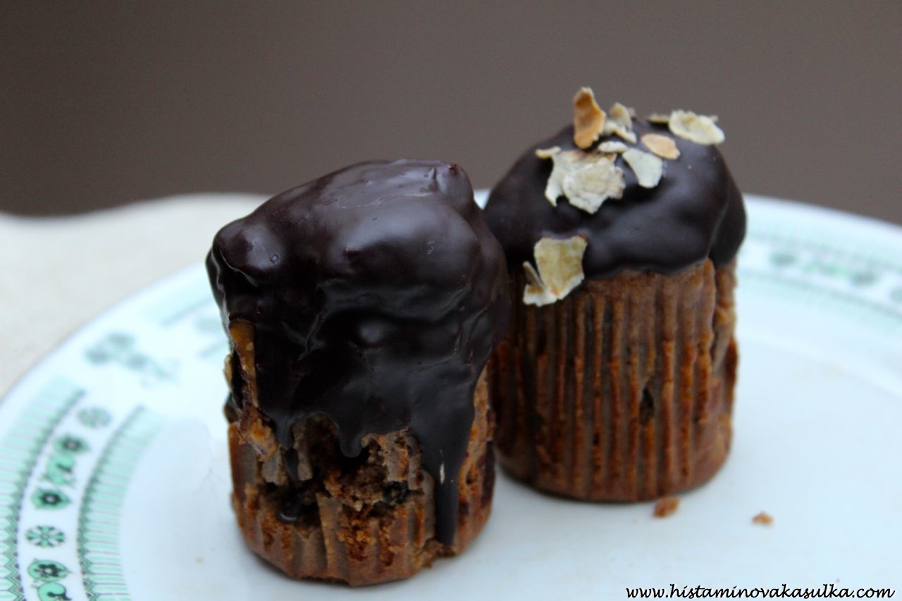 Ano ano, už se možná zase pozastavujete nad tou čokoládou. Ano, také reaguji na čokoládu z obchodu (nedávno ověřeno, pálení žáhy, nevolnost, bolest hlavy). Ale domácí poleva z kakaového másla a nepraženého kakaa mi prostě nějak nevadí. Stejně tak pražené boby (které si doma sama posekám). Možná to bude i tím množstvím, kterého na jednom mufínku zase není tolik. Samozřejmě není problém polevu vynechat, v tom případě doporučuji potřít alespoň domácí marmeládkou nebo arašídovým máslem. Mufiny zas budou o kousek zajímavější.