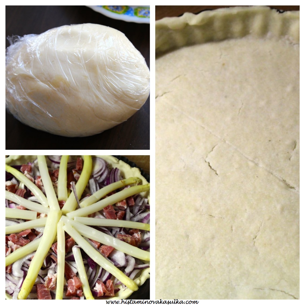 Tentokrát jsem se s tím nepiplala a použila recept na krustu, který byl na zadní straně mouky Doves. Tu jsem dostala. Přestože nemám předmíchané směsi moc ráda, mnohem více se mi příčí jídlo vyhazovat, zvláště, když se jedná o dárek. Musím říct, že díky obsahuju škrobů se s těstem pracovalo dobře. Můžete klidně využít i krustu z předchozího quiche nebo prostě svoji oblíbenou. Nebojte se experimentovat!