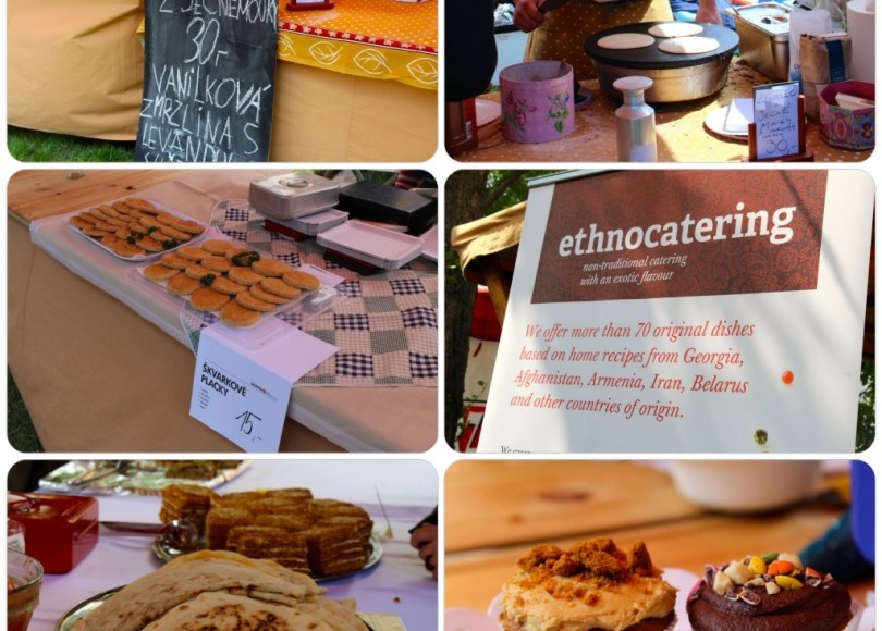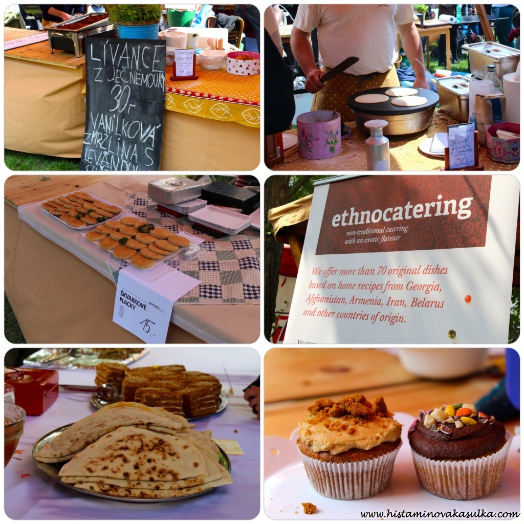 Holky ze Sugar town udělali celou sérii cupcakes, které zdobily přímo na místě a byla radost pohledět. Jan Kořínek z Ke kořenům dorazil s ječnými lívanci a zmrzlinovými sendviči z upečených sušenek a domácí zmrzliny. Další v řadě profíků, se kterými jste mohli mít tu čest, je Ethnocatering. Kulturní pestrost, původní recepty, autentičnost, originalita i podpora a společenská odpovědnost. V odpoledních hodinách už měli také zoufale prázdné tácy a vyprodáno. kolaz jidlo 2