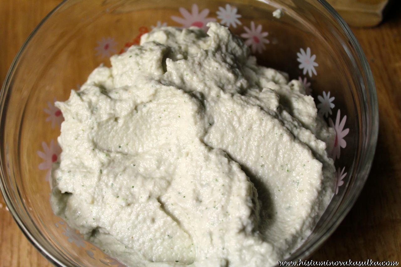Mezitím si připravíme „zakysanku“. Květák omyjeme, rozdělíme na růžičky a dáme společně s kešu ořechy do mixéru. Přidáme ocet a mixujeme. Po lžících přidáváme studenou vodu, přidáme tak 2-3 lžíce, ale bude záležet na výkonnosti vašeho mixéru. Přidáme rozdrcený česnek a rozmixujeme do hladkého krému. Můžeme přidat i další oblíbené koření. Uchováváme v lednici do podávání. Dobrou chuť.kolaz2