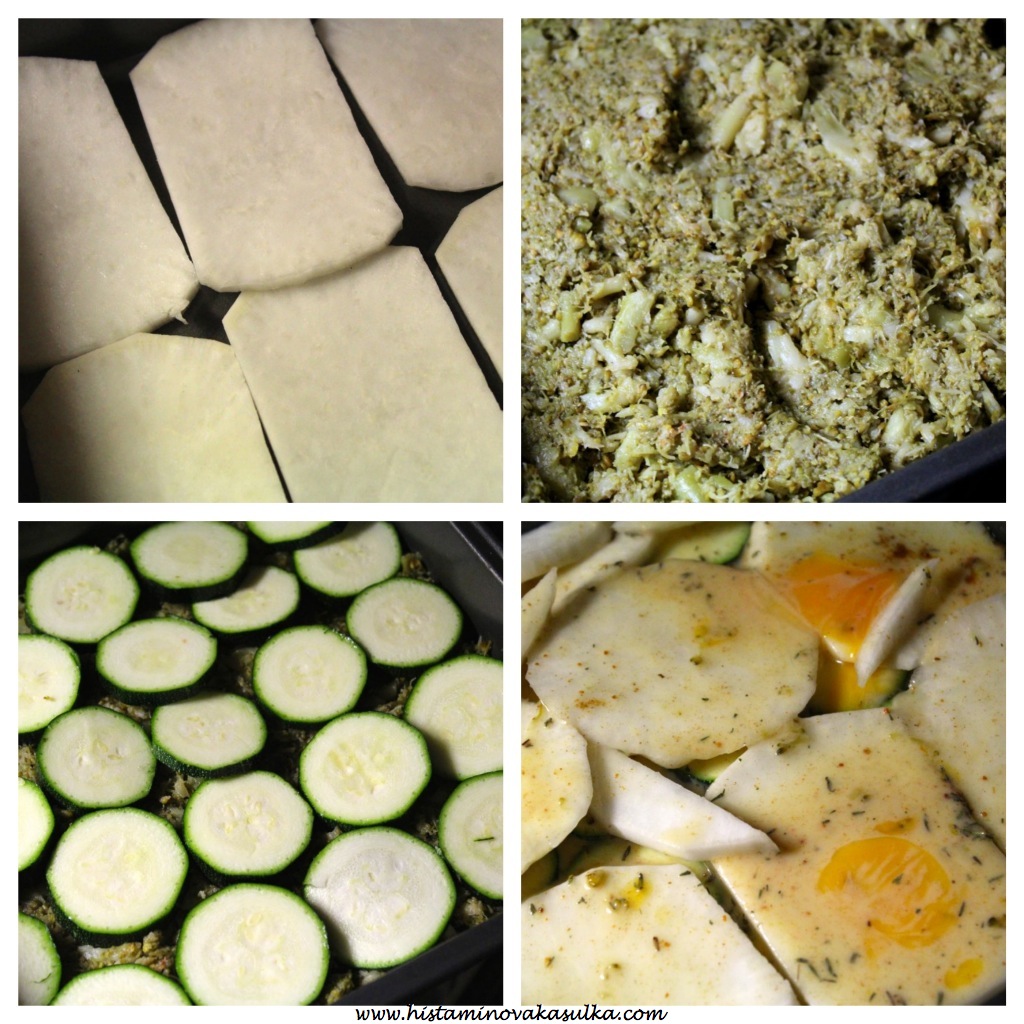 Brokolici omyjeme a dáme na cca 10 minut do páry, aby krásně změkla. Po uvaření ji dáme do misky a rozmačkáme (udělátkem na brambory nebo prostě vidličkou). Přidáme 1/2 lžičky soli a lžičku mletého kmínu, můžeme přidat trochu pepře. Vodnici oloupeme, nakrájíme na tenké plátky a rozdělíme na dvě části (půl půjde dospod, půl na povrch). Cuketku dobře očitíme a nakrájíme na kolečka. Na plech položíme plátky vodnice, natlačíme brokolici, poklademe nakrájenou cuketou.kolaz 1