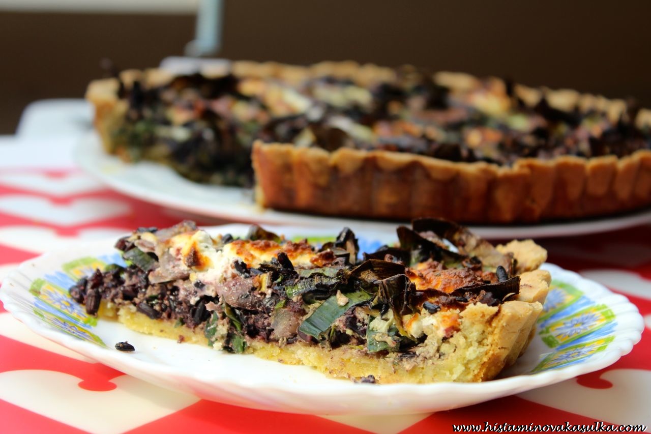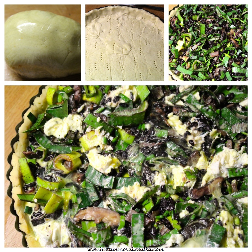Mezitím slijeme vodu z hub, odstraníme pevné nožičky a nakrájíme na tenké plátky. Na pánvi zpěníme nasekanou cibuli na másle a přidáme houby. Lehce osolíme a necháme cca 5 minut osmažit. Pór nasekáme na drobno a smícháme s nasekaným rozmarýnem. Přidáme osmahnuté shitake a rýži. Předpečený korpus naplníme směsí, podrobíme kozím sýrem a zalijeme směsí rozšlehaného vajíčka ve smetaně. Dáme péct do trouby na dalších 40 minut. Necháme lehce vychladnout a podáváme. Dobrou chuť.