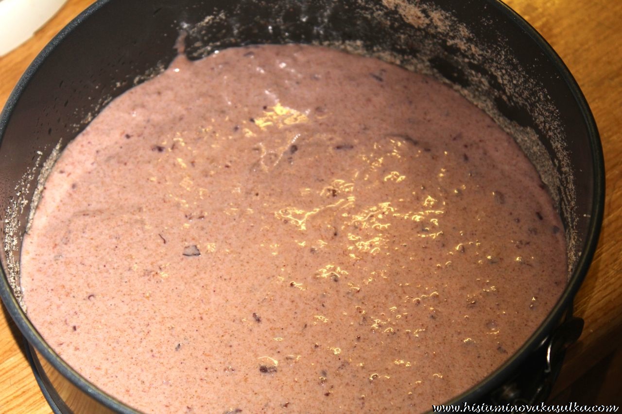 Troubu předehřejeme na 180°C a nachystáme si formu o průměru 18 cm. Všechny ingredience smícháme dohromady, necháme 5 minut odstát a nalijeme do formy.