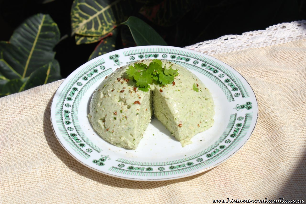 Dáme do lednice uležet na 2 hodiny. Poté vyklopíme na talíř a podáváme. Skvěle se hodí jako náhrada mozzarely, do salátu i na „chlebíčky“. Samozřejmě pokud byste raději „sýr“ bílé barvy, přidejte nasekaný koriandr až po zpracování hmoty. Dobrou chuť.