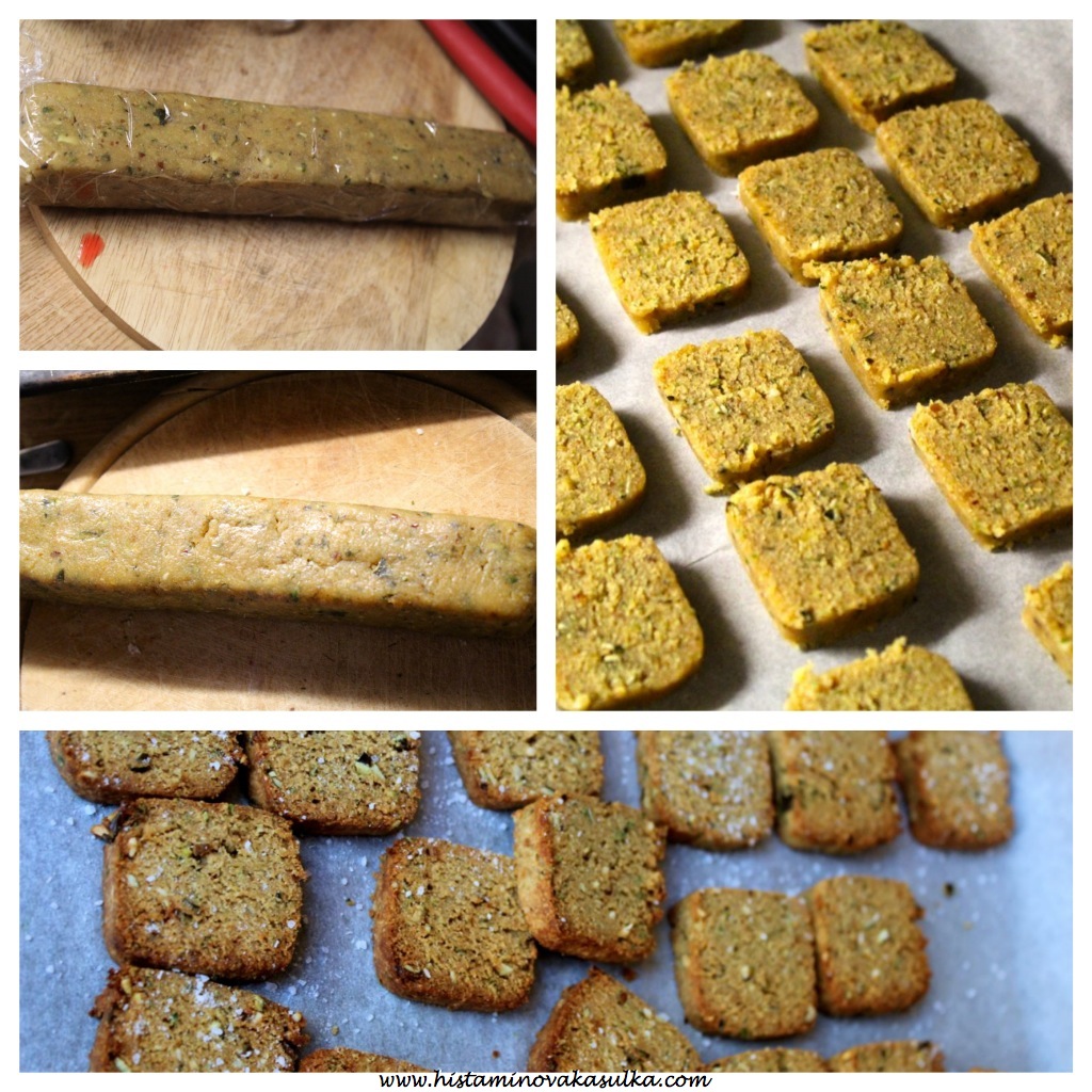 Mouku smícháme s gomasio a solí (pokud chcete sušenky opravdu slané, cizrnová mouka vyžaduje více soli než jiné). Přidáme olivový olej a tahini a rukama zpracujeme na drobivé těsto. Zapracujeme celé vejce. Poté po lžících přidáváme rostlinné mléko, dokud se nám nevytvoří hladké těsto. Uhněteme a vytvarujeme kvádr (o kratších stěnách cca 3 cm). Zabalíme do potravinové fólie a uložíme na půl hodiny do lednice.kolaz 1