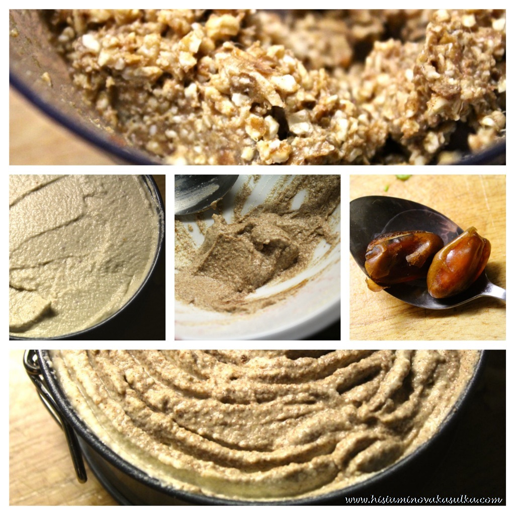 V den D ořechy i datle slijeme a necháme dobře okapat. Společně se skořicí a malinkatinkou špetkou himalájské soli dáme do sekáčku a řádně spolu zpracujeme. Díky tomu, že jsou ořechy či datle mokré, nepodaří se nám zpracovat na jemno, což vůbec nevadí. Pokud byste rádi hladkou krustu, nechte ořechy po namáčení vysušit a poté zpracujte. Vzniklou hmotu natlačíme do formičky a pořádně „uňahňáme“.