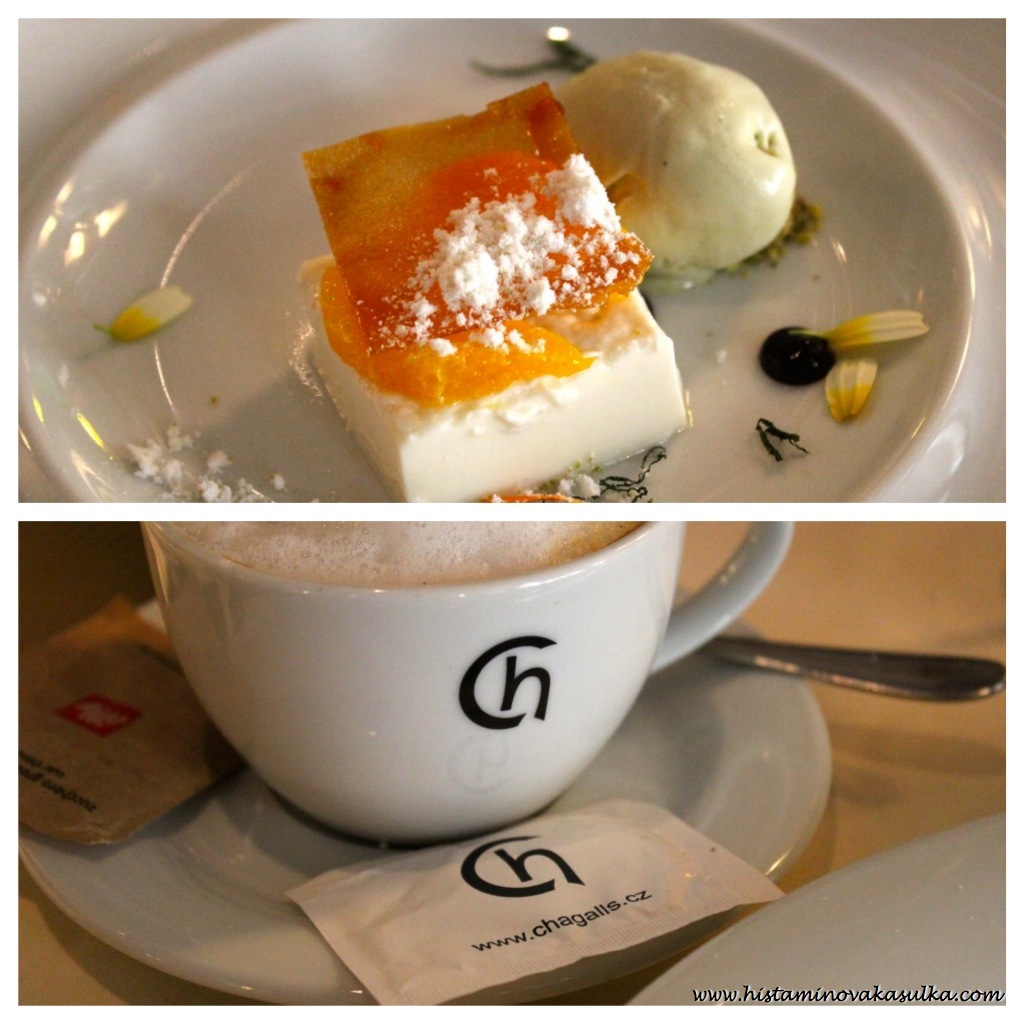Jako dezert jsme pak dostali panna cotta s pistáciovou zmrzlinou. K dezertu nám nabídli také kávu a tak jsem se rozhodla ochutnat „kapučíno“ (za krásnou cenu 49 kč, což na Prahu není vůbec zlé). Bohužel káva přišla asi tak v půlce dezertu, což mě trochu zklamalo (a do dezertu jsem se musela pustit, jelikož se začala roztékat zmrzlina).