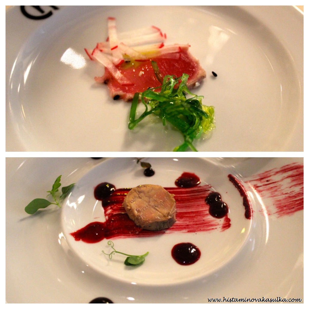Na úvod jsme dostali skleničku šampaňského Mailly Grand Cru, kterou jsem si opravdu vychutnala. Šampaňského jsem se musela před časem vzdát, tak je taková ochutnávka ještě vzácnější. Musím tedy říct, že mi obsluha přišla poněkud zmatená. Nejdříve nás usadili podle rezervace, ale neměli poznamenané, že se jedná o L&T, což mě docela překvapilo. Přišli se vlastně zeptat několikrát, co se týče alergií a celkově působili i při servírování trošku zmateně. Večeře začala amuse bouche, z čerstvého tuňáka (kterého porcují přímo na místě, tedy zaručeně čerstvé). Jako předkrm pak přišlo foie gras s černým rybízem a domácí brioškou. Svou porci jsem dostala samozřejmě bez briošky, ale také jsem nedostala žádné pečivo k předkrmu (vím, že je to trochu rozmazlenost, ale z restaurací na lepší úrovni jsem zvyklá, že jsou schopni v předstihu zajistit bezlepkové pečivo či krekry). V tuto chvíli mě trochu iritovalo, že mi místo na stole stále zabíral talířek na pečivo, které jsem očividně nemohla.