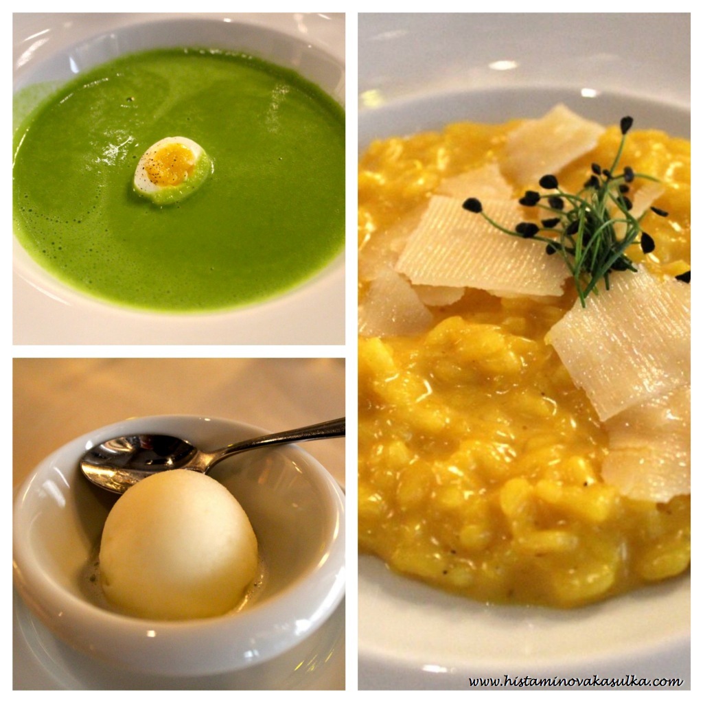 Poté nám přinesli krémovou polévku z čerstvého hrášku a máty s křepelčím vajíčkem. Musím uznat, že ta byla vynikající, jak konzistencí, tak chutí. Po polévce následovalo milánské rizoto s parmezánem. Přestože se někomu mohou zdát porce malé, už v tuto chvíli se člověk cítí docela sytý. Chutě jsou totiž velmi silné a stačí pár soust, aby měl člověk pocit plnosti. Možná to je také kouzlo kvalitního vaření, jídla pak stačí mnohem méně. Po rizotu jsme dostali výborný limetkový sorbet, abychom připravili chuťové buňky na hlavní chod. Přísahala bych, že v sorbetu bylo nějaké koření, ale zapomněla jsem se zeptat.