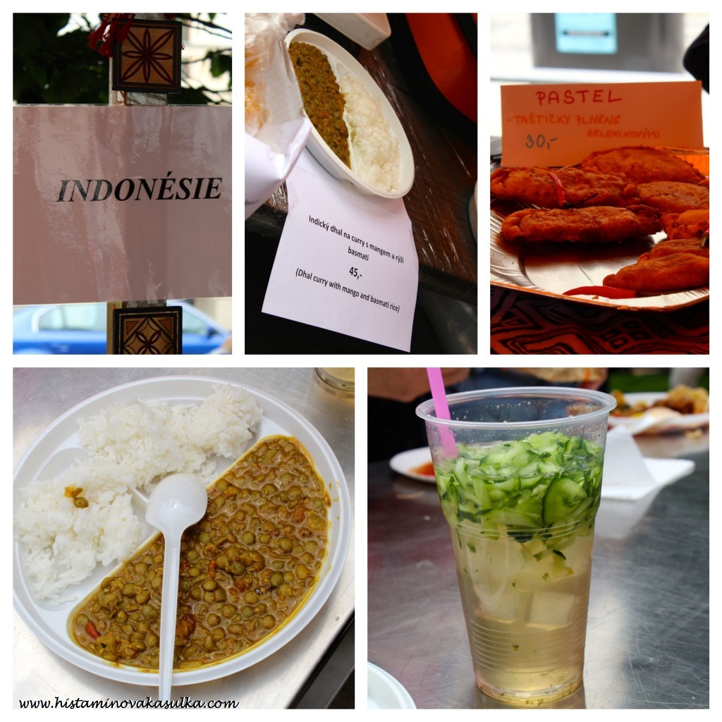 Dlouho jsem přemýšlela, odkud začít, jestli brát recenzi stánek po stánku, ale nakonec jsem se rozhodla jít podle chutí a zážitků. Takže mezi prvními bych jistě zmínila stánek Indonésie, kde jsem si dala luxusní dhal kari s mango a zázvorem. Jedná se tedy o pokrm z čočky, který byl zahuštěn pouze zázvorem a nemusela jsem se bát o lepek. Vše doplněno basmati rýží (45 kč). Pokrm byl příjemně pálivý a dalo se k němu dokoupit také pár kukuřičných lupínků s Tika Masala kořením (5 kč balíček). Hned vedle nabízeli další pokrmy (salát s arašídovou omáškou, pastel), ale hlavně skvělou osvěžující limonádu s mátou a spoustou nastrouhané okurky.