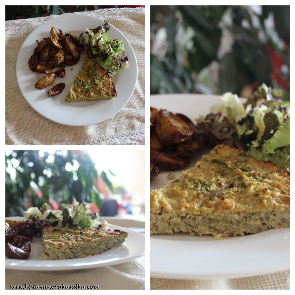 1. Byla to mladá cuketa, která neměla tolik vody, tak jsem myslím nemačkala, ale když si nejsem jistá, vždy trochu před slaným pečením promačkám. Konzistence je trochu hutnější a vlhčí, proto je to frittata a ne koláč, lépe na vidličku, ale povrch byl dozlatova, dalo se to vzít do ruky jako slaná pizza.