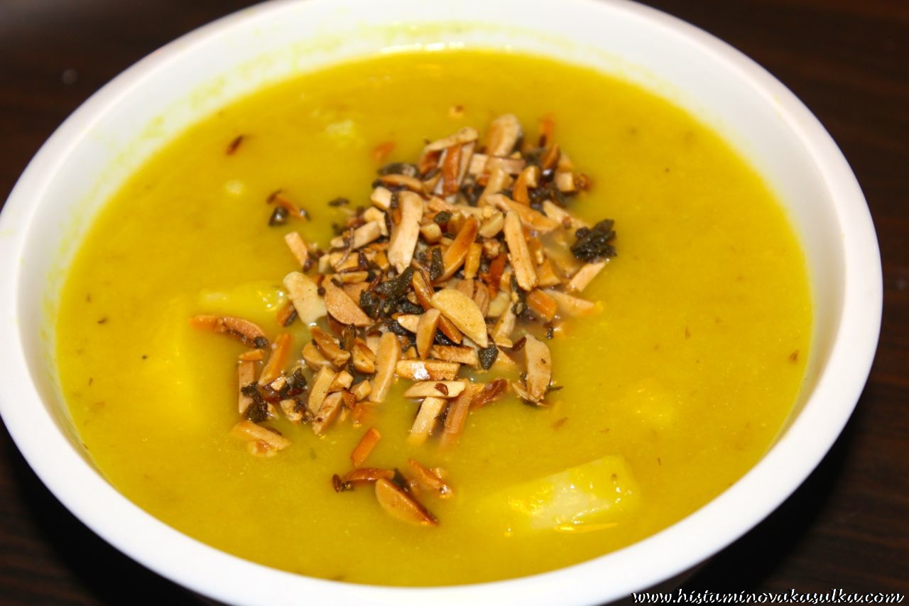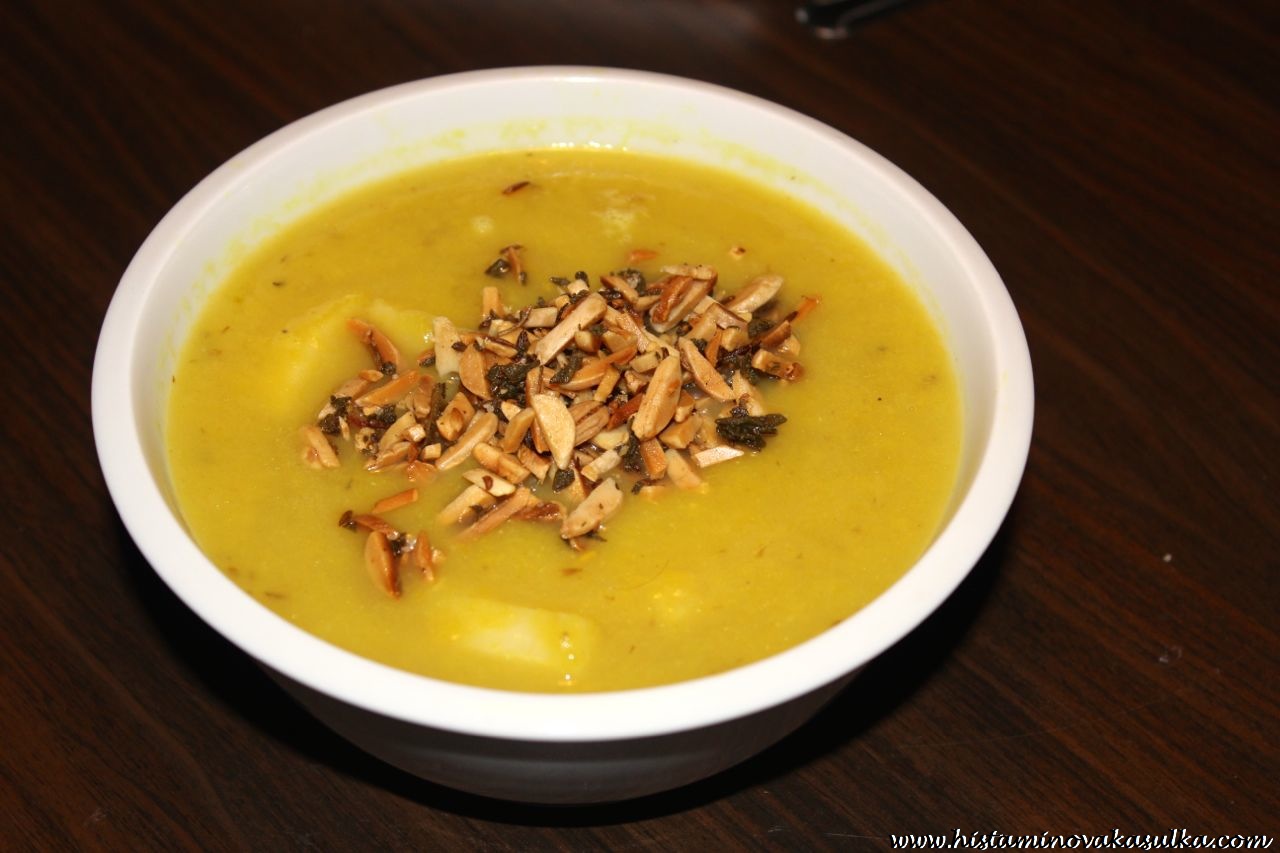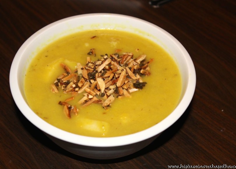 Pórková polévka s kurkumou a šalvějovými mandlemi