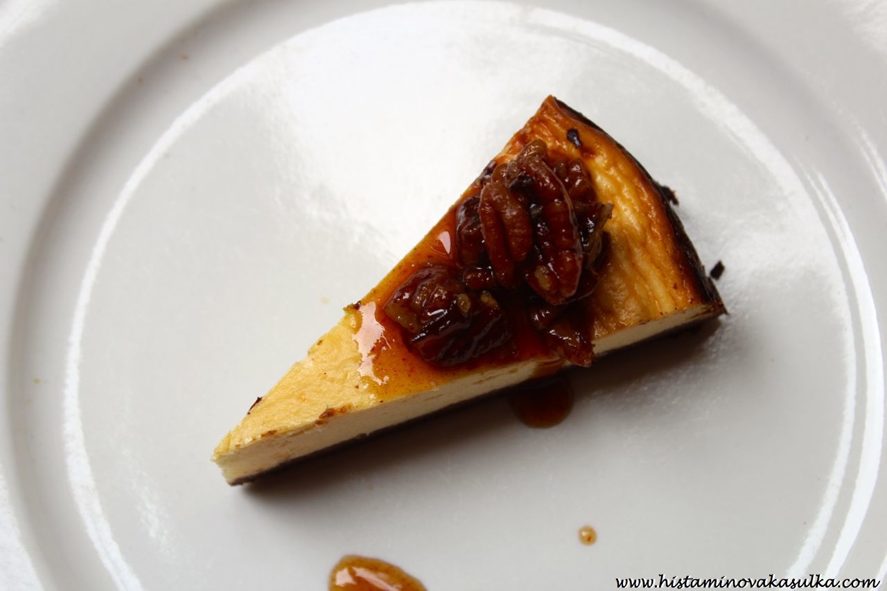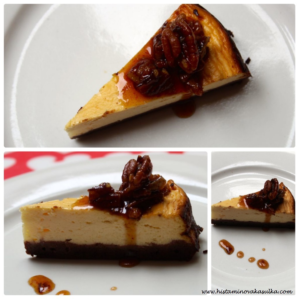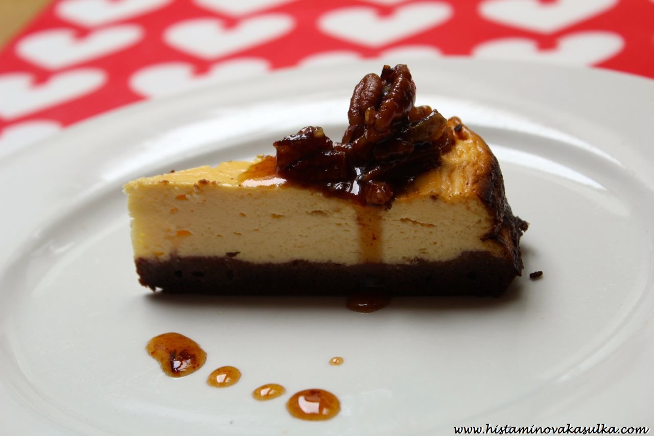 Tvarohový dort na brownie podkladu s karamelizovanými pekanovými ořechy