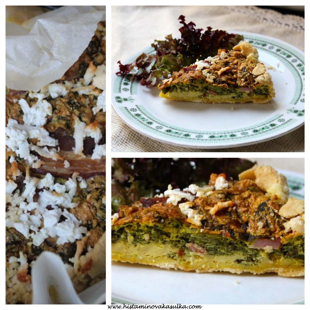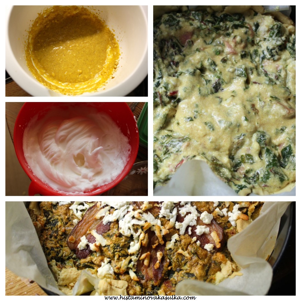 Oddělíme si bílky od žloutků a bílky se špetkou soli vyšleháme do hustého sněhu. Žloutky rozmixujeme s měkkým nezrajícím sýrem (či třeba krémovým tofu, ricotou, kdo snese, může dát zrající brynzu), přidáme koření a vmícháme připravený mangold s bazalkou. Pokud budete přidávat pečené vepřové maso, nakrájejte jej na malé kousíčky a vmíchejte do směsi. Dále vmícháme bílkovou pěnu a náplň přesuneme do připraveného korpusu. Ozdobíme slaninou (pokud používáte). Dáme péct na 50 minut. Před dopečením můžeme posypat trochou sýru. Nechte vychladnout a podávejte. Dobrou chuť.