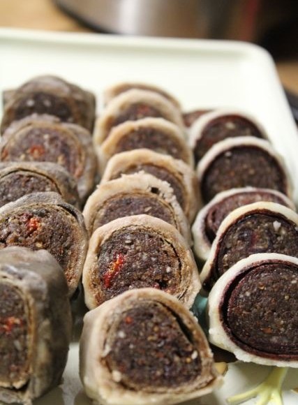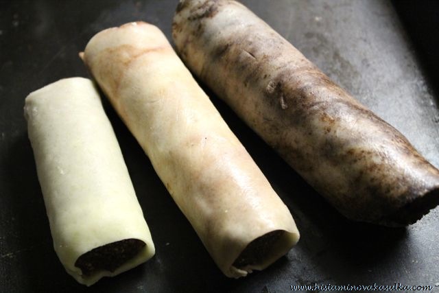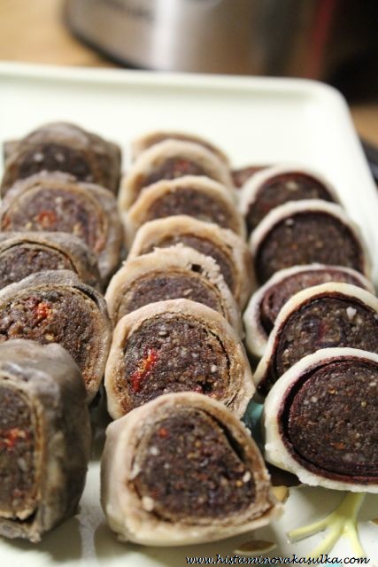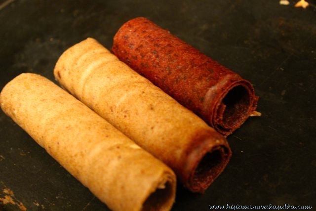 Nejdříve si připravíme rolky a to klasickou přípravou na sušené ovocné placky (topení, sušení sluníčka, sušička nebo třeba trouba do 42°C). Po sejmutí papíru na pečení srolujeme po užší straně do trubičky, konce pevně přimáčkneme. Trubičky si rozkrojíme na cca 10-15 cm, aby se vám dobře plnili. Pevně srolované necháme na plechu na sluníčku nebo na topení.