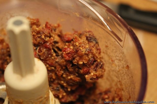Z předem namočených ořechů a zbylých ingrediencí si v sekáčku vytvoříme lepkavou pevnou hmotu, kterou plníme trubičky.