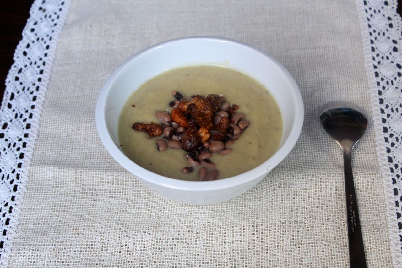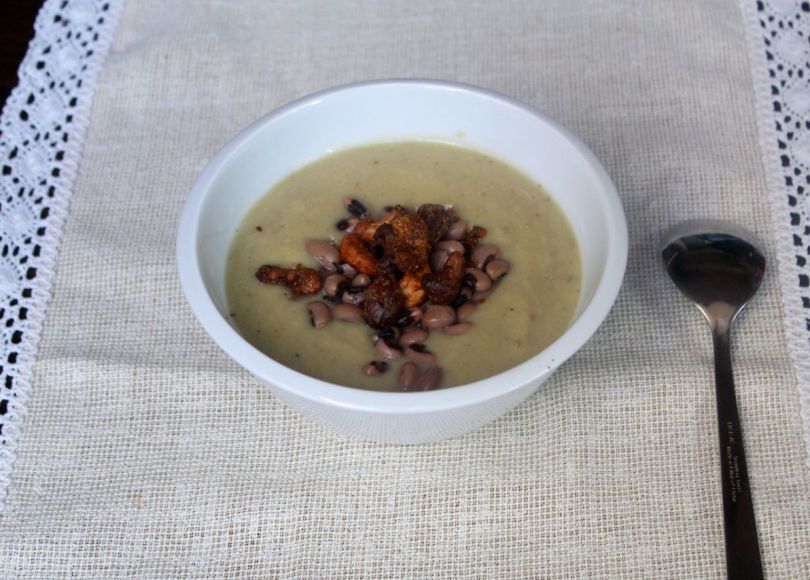 Při vaření polévky by se část vody měla vyvařit, vodu doplníme na závěr podle požadované konzistence polévky. Uvařenou zeleninu rozmixujeme na hladký krém a vmícháme kešu máslo. Přidáme uvařenou fazoli, případně dosolíme. Na talíři přidáme trochu zauzených kešu. Dobrou chuť.