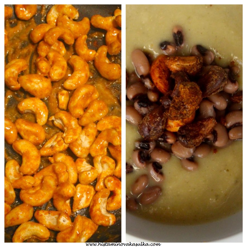 Fazole dodá nejen vlákninu a minerály, ale spoustu aminokyselin, ze kterých si vybudujete všechny potřebné bílkoviny. A kešu máslo poslouží jako zdroj zdravého tuku, ve kterém se spousta těch zdravých vitamínů může rozpustit:) Když je navíc tuk z oříšků taaaaak dobrý, kdo by jej nechtěl jíst. K tomu si malinko malinko zahřešíme a opečeme si pěkně na prudko kešu oříšky ve směsi kešu másla a koření „uzená paprika“. Pozor, doporučuji neochutnávat, nebo je sníte dříve, než se polévka uvaří. Zajímavá chuť grillu, žádné glutamáty, žádné umělé barviva!