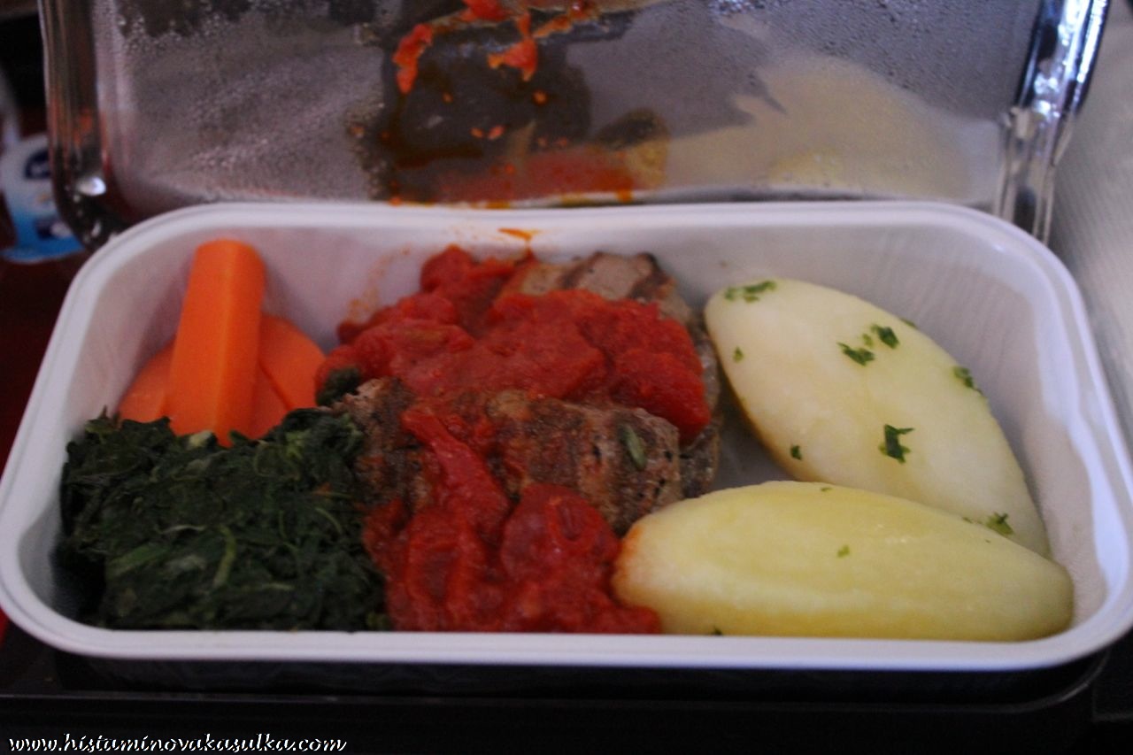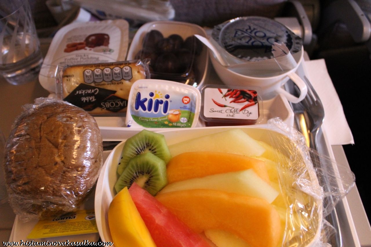 Jako hlavní jídlo (oběd) vám donesou mističku s trochou nakrájené zeleniny (mrkev, která byla vážně za zenitem, jelikož už měla zkyslou chuť, žlutou a zelenou cuketu, okurku a červenou papriku, mohlo mít tak 100 g) na špalíčky a k tomu jogurtový dip (co je na dipu raw vegetable?). K tomu opět houstičku (samozřejmě lepkovou), kousek sýru (!), jako předkrm mističku zeleniny (plátek hořkého salátu, plátek okurky a plátek rajčete) a jako zákusek mističku ovoce. Když říkám mističku, myslím tím plátek ananasu, plátek melounu, plátek švestky a pláteček manga). Opět jsem si říkala, zda třeba Raw Vegetable Meal nemá znamenat talíř čerstvé zeleniny. Kaloricky jsme se dostali asi tak opět na nulu, když vynecháme houstičku a sýr. Tentokrát tam alespoň nepřidali krekry s roztíratelným sýrem a čokoládičkou, to už asi moc raw vegetable nebylo. No v tomto směru opět velké zklamání. Když nabízím jako možnost jídla raw vegetable, měla bych se podle toho zařídit, nabídnout cestujícím alespoň srovnatelnou náhradu normálního jídla. Mezi jídly už žádná svačinka ani přilepšení nebylo (zlaté evropské společnosti, která vám dají alespoň čokoládku nebo oříšky).
