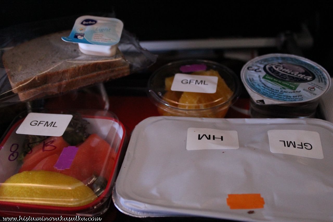 Nejsem si jistá, zda je letecká společnost povinna zajistit určitý příjem kalorií či množství jídla, ale ráda bych viděla, kdo menu sestavuje. Zvláště u aerolinií,které se chlubí svou exkluzivitou a nadstandardními službami. U bezlepkové diety si zřejmě myslí, že je potřeba vynechat jakékoli koření včetně soli, přidat „zdravý“ margarín a nakonec ústa místo dezertu zaplácnout trochou nezralého(!) ovoce. Také netuším, proč je bezlepkové jídlo kaloricky silně redukované oproti normálnímu jídlu a není zajištěna náhrada všech jídel. To mají být lidé za svou nemoc ještě trestaní? Možná kdyby Emirates vynaložili méně peněz na tisknutí menu pro cestující, mohli by investovat do lepšího výživového poradce. Ať se na to dívám z jakékoli strany, pokud vám záleží na vašem zdraví a chcete cestovat bez újmy, doporučuji si vzít na palubu vlastní jídlo a let nějak přežít bez teplého jídla (případně si na přestupu mezi letadly dát na letišti smoothie, které vás nejen zasytí, ale také dodá potřebné vitamíny i minerály).
