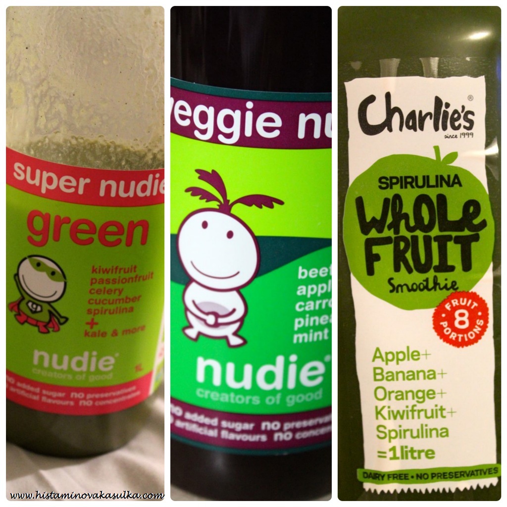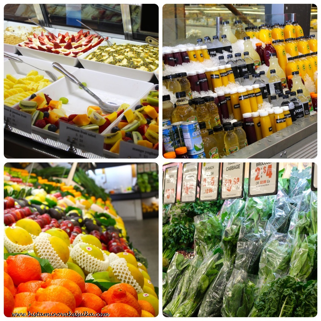 Jelikož jsem kupovala převážně ovoce a zeleniny, cena se obvykle vyšplhala docela vysoko. K tomu jsem si oblíbila smoothie, které splnilo funkci snídaně, někdy svačiny i večeře. Předpokládám, že i díky smoothie (a chlorella) jsem uhlídala zažívání na uzdě. Můj oblíbený se stal Cleansing smoothie od Nudie (1 litr za $6, ve složení hruška, jablko, celer, kadeřávek, okurka, salát a spirulina). Zkoušela jsem také jejich Berry blast (jablko, malina, brusinka) a červený džusík (který obsahoval trochu ananasové šťávy, se kterou nemám moc dobrou zkušenost, ale přežila jsem!), ale byl prostě ten zelený. Abych trochu prostřídala značky, zkoušela jsem také zelený od Charlie se spirulinou (trochu pomerančové šťávy) a nebyl špatný, ale od Nudie byl mnohem lepší.kolaz 5