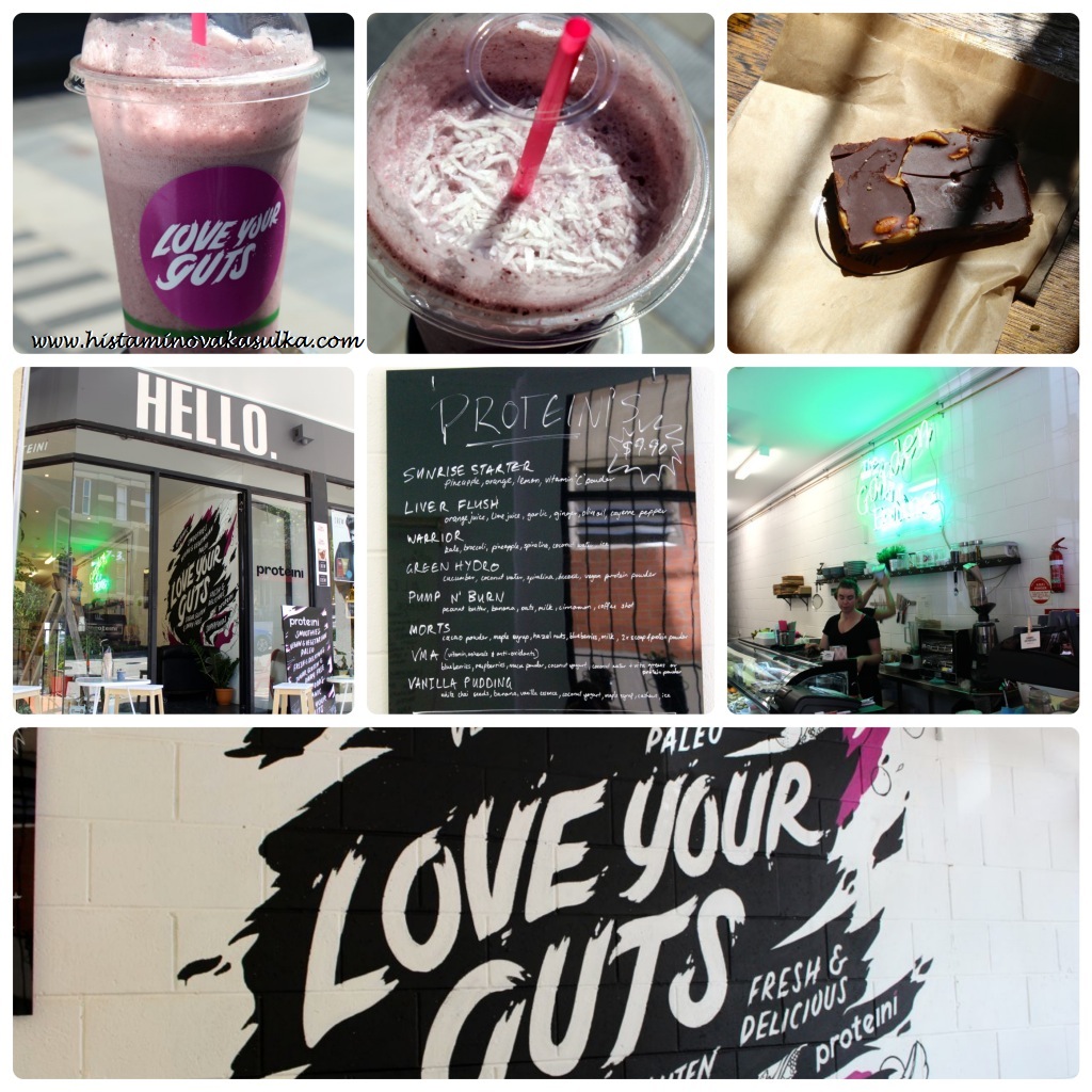 Na cestách jsem měla jen dva menší problémy, tedy dvakrát zvracecí příhodu. Jednou to byl sýr v kombinaci s cizrnou, kterou jinak toleruji skvěle, ale tentokrát to byl asi příliš velký mix, po druhé to byl oběd na konferenci. Proto jsem si dávala raději pozor. Super zážitkem z jídelního pohledu je pro člověka Sydney. Někdo si klidně dá na oběd čínu za $15 dolarů, já za stejnou cenu raději koupím pořádné smoothie a raw dezertík. Zasytí mě to úplně stejně, přičemž výživová hodnota je jistě lepší v mé variantě a co více – hlavně mě udrží zdravou. Pokud tedy smýšlíte podobně jako já, tak doporučuji navštívit Proteini a pak také Whole Meal Cafe. Proteini Cafe se nachází na Crown street v oblasti Darlinghurst (poblíž Taylor square či Hyde Park). Jedná se o novější zařízení, kde si dáte ňamku od 7 od rána do zhruba třetí odpolední hodiny. Vše připravují ten den čerstvý a do svých smoothies přidávají některou ze superpotravin. Já jsem zvolila antioxidační mix se směsí zelených superpotravin, protože jejich proteinový prášek je sice vegan a gluten-free, ale obsahoval kvasnice. K tomu jsem vyzkoušela raw snickers, která na můj vkus byla sice trochu dost mastná, ale nic lepšího jsem v Sydney neměla (celý oběd mě tak přišel na $15). Samozřejmě fair-trade káva a možnost výběru z různých salátů či ovocných misek. Jejich hlavním heslem je, že jídlo má podpořit zdravá střeva, a ne škodit. Určitě doporučuji. kolaz 12