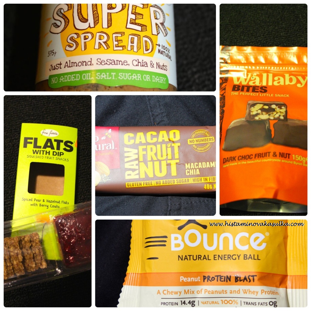 Z dalších větších obchodů je pak Coles, kde měli také celý regál bezlepkového a bezalergenního zboží (Schar, Sams Mills, místní značky). Já jsem naprosto propadla arašídovému máslu s kokosovou příchutí (arašídy, kokos za $5 v akci, neodolala jsem a domů jsem si přivezla pomazánku stejné značky z mandlí, chia semínek a sezamu za $7,50). Mimo to prodávali třeba ve Woolworths také jednoduché svačinky, což byly třeba bezlepkové oříškovo-ovocné placičky a čerstvé rozmixované ovoce (nalezeno v chladícím regálu). Pokud při lezení po kopcích a přírodě upřednostňujete lehčí rychlé svačinky, které vás zasytí a dodají vám energii, můžete sáhnout po těch raw nebo pak po bezlepkových proteinových „koulích“ (pokud tolerujete syrovátku). kolaz 14