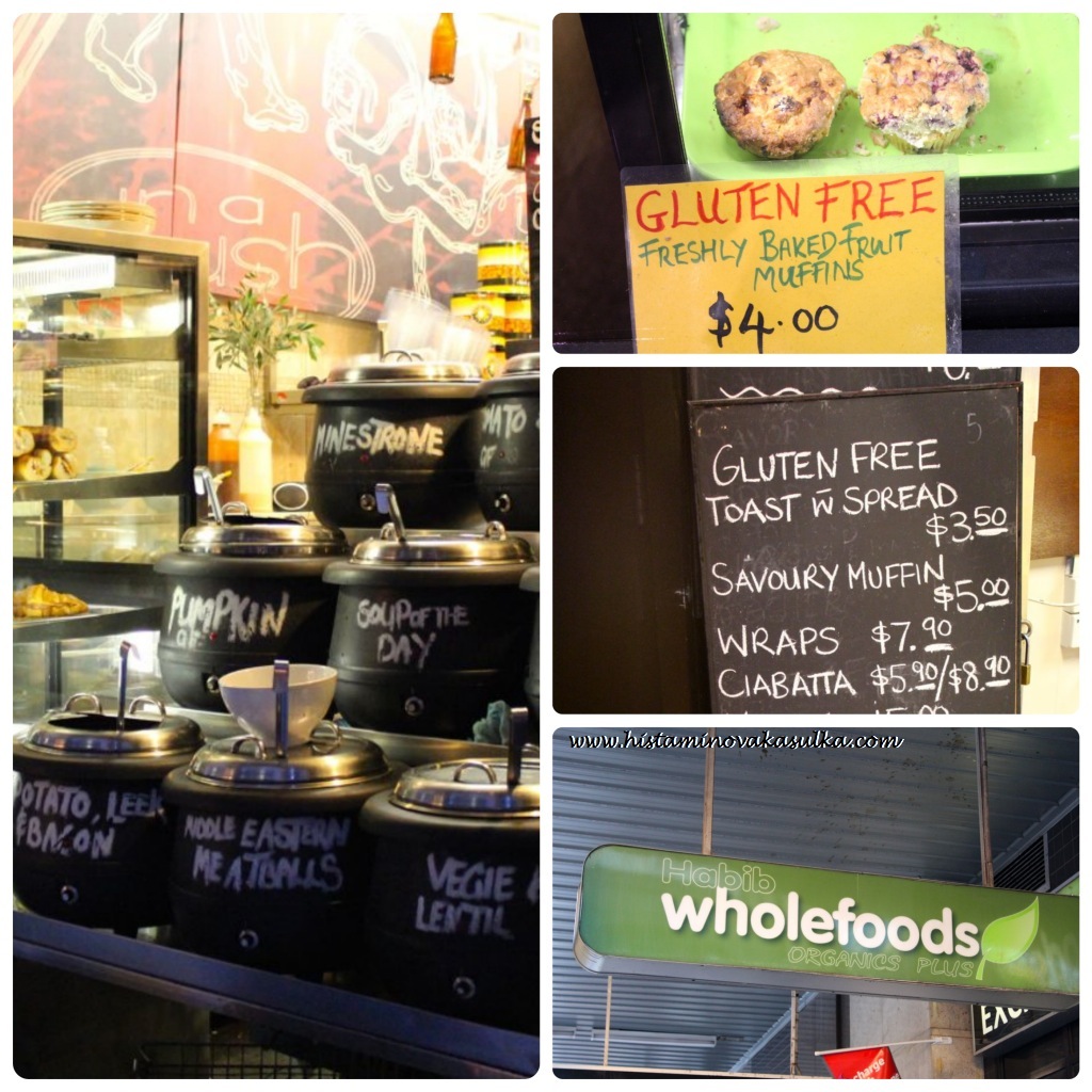 Například v Melbourne cestou od nádraží narazíte hned na několik restaurací a jídelen, které mají v menu alespoň jednu bezlepkovou pochoutku. Ať už je to toast s pomazánkou nebo třeba muffin, stačí obejít pár bloků a nejdete, co je vám po chuti. Krom běžných restaurací a „rychlých“ občerstveních najdete i ta zdravější zařízení, kde si třeba dáte salát s quinoou nebo jinou pochoutku. Hned naproti nádraží je Habib wholefoods, kde nabízeli potraviny poněkud dráž, ale zase měli nabídku čerstvého i bezlepkového jídla pozdě odpoledne. Vše v bio kvalitě, třeba bezlepková frittata, lasagne, koláčky (vše kolem $6-10, což jsem až později pochopila, není tak špatná cena), bezlepkové vegan saláty (350 gr za $7), raw zákusky $8 dolarů (raw zákusky byly v celé Austrálii poměrně drahá záležitost), raw tyčinky kolem $3.