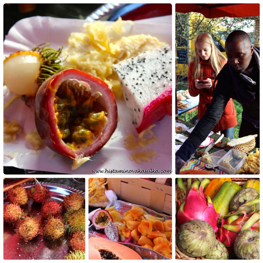 Chvilku jsem přemýšlela, zda to vzít prostě popořadě nebo třeba od toho nejmíň hnusného a nejmíň hýbajícího se jídla. Nakonec jsem se rozhodla, že to vezmu v nějakém tom chutnacím pořadí. Kdo potřeboval trochu nakopnout, mohl začít jednoduše exotickým ovocem, které jinak nemáte moc šanci ochutnat. Podle mě si teda nasadili trochu vyšší ceny, které neodpovídaly porcím, prostě celková suma byla takovým odhadem (mohu klidně říci, protože paní před námi měla to stejné plus dvě položky navíc a platila jen o 25 kč více, což rozhodně neodpovídalo porci jackfruit a papayi navíc). Každopádně drahý špás, ale zase jste mohli ochutnat proslule smradlavý durian, nakyslou marakuju, neutrální rambutan nebo třeba semínkové dragon fruit. Vzhledem k tomu, že chutě byly docela neutrální, nesázela bych na nejlepší kvalitu (slyšela jsem od cestovatelů teda jiné informace). U stejného stánku jste mohli koupit také žabí stehýnka.