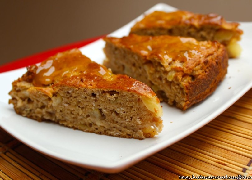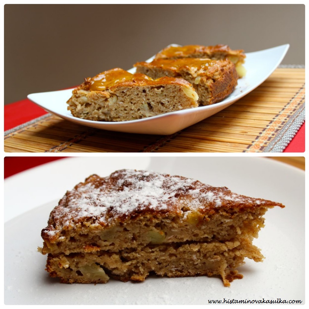 Smíchejte všechny suché ingredience. Zvlášť smíchejte tekuté ingredience a směs přidejte k suché směsi. Vznikne tuhé těsto, do kterého vmícháme nasekaná jablka (oloupaná, zbavená jadřince, nasekaná na menší kostičky, můžeme přidat třeba i vlašských ořech atd.). Těsto rozetřeme do připravené formy a pečeme 30 minut. Necháme na mřížce vychladnout. Po vychladnutí můžeme uprostřed rozkrojit a potřít marmeládou pro vláčnější chuť, ale nemusíme. Těsto lze i rozdělit do mufinové formy na 12 mufinů, přičemž těsto budete muset nabírat lžící. Dobrou chuť.