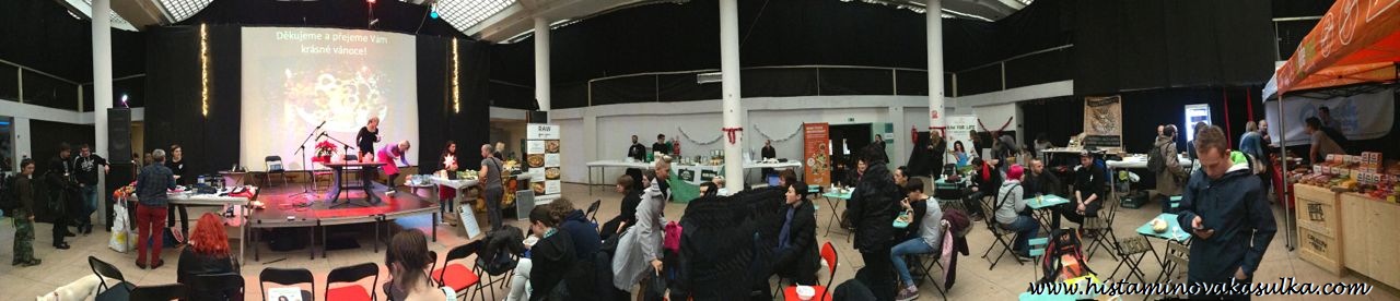V docela malém prostoru se sešlo pár restaurací a obchodů, které nabízí veganské stravování. K mému překvapení jich není moc a většina byla zaměřena na raw veganskou stravu. Než se vrhneme na ochutnávání, zmíním i program, který probíhal v průběhu akce. Závidím všem, kdo mohl strávit takhle před Vánocemi na festivalu celý den a účastnit se více přednášek i kuchařských show. Na festivalu se také představovala nová veganská kuchařka Banán místo vejce a mohli jste prolistovat i raw kuchařkou z produkce Secret of Raw, která je mimochodem opravdu nádherná:)) Kromě toho bylo také několik přednášek na téma veganství a sport. Já jsem měla to štěstí vidět přednášku s Vladimírem Fuťákem, který k mému překvapení mluvil opravdu dobře a měl velmi rozumné rady, tipy i názory (což mě u trenéra velmi překvapilo, obvykle jsou schopní tvrdit opravdu hovadiny). Pokud na něj někde narazíte, tak vřele doporučuji (ať už vás zajímá složení stravy, vliv na cholesterol, vitamíny, doplňky, správný režim, jak je to s bílkovinami, sacharidy, intermittent fasting atd.).
