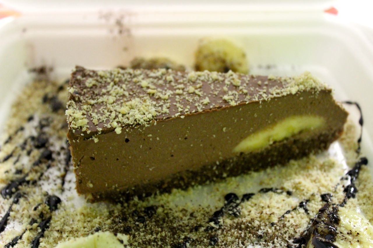 Jako vážně jsem si chtěla dát nějaký zákusek, ideálně alespoň dva, abychom toho z Bemby ochutnali co nejvíce. Ale nešlo to. Prostě to nešlo. Po jedné porci (samozřejmě s ochutnáváním z druhé porce) jsme byli tak nacpaní, že na zákusek hned po jídle prostě místo nebylo. Když jsem se ale dozvěděla, že v denním menu byl zrovna banánový dortík s karobovým přelivem, musel s námi putovat alespoň domů. Raw strava má tu velkou výhru, že vás nezabetonuje na dlouho a po pár hodinách vám skvěle vytráví a s chutí se pustíte do další konzumace. Třeba tohoto dortíku. No a paní měla prostě pravdu, dortík byl opravdu povedený a k mému překvapení nebyl vůbec přeslazený, jak jsem zvyklá z pražských restaurací. Obvykle se mi totiž zdá (i u některých smoothie z restaurací), že je vše prostě příliš sladké. Tento dort byl opravdu jen jemně nasládlý, dával vyniknout chuti banánů a vše krásně dokončila tenká vrstva ořechového základu. Aneb jak se říká – nebe v papulce.