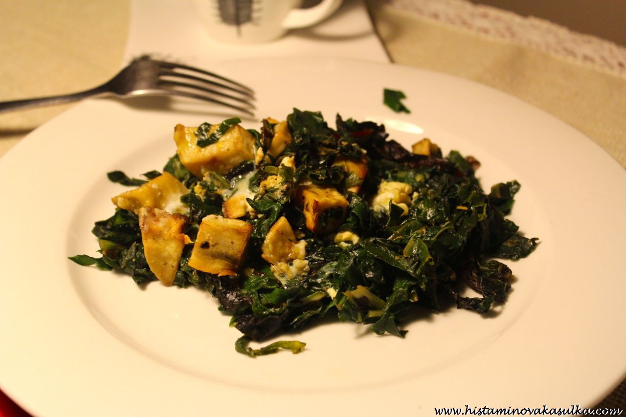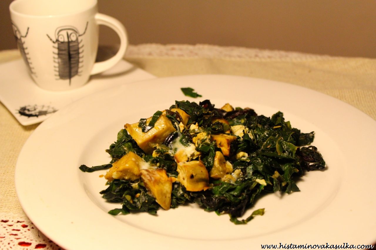 Mezitím dobře očistíme mangold, necháme okapat a odtrháme pevné stvoly od listů. Listy nasekáme na drobno. Na větší pánvi na trošce vody listy mangoldu spaříme (aby povadly). Odstavíme. Jakmile se dopečou batáty, vmícháme batáty k mangoldu a znovu prohřejeme. Rozdělíme na dvě části a uprostřed každé části uděláme jamku. Pokud připravujete pro sebe jako histaminika, udělejte jamku větší, abyste mohli vejce promíchat a dobře prohřát všechny části. Pokud připravujete pro někoho jiného, udělejte důlek, doprostřed rozklepněte vejce a nechte propéct pár minut. Podávejte teplé. Dobrou chuť.