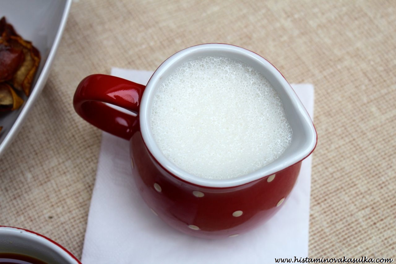 - trochu čerstvého rostlinného mléka (já jsem použila kešu mléko, kešu dvě hodiny namočit, propláchnout, pořádně rozmixovat s vodou, případně přecedit, ihned konzumovat)/případně trocha čerstvé citrónové šťávy, pokud tolerujete