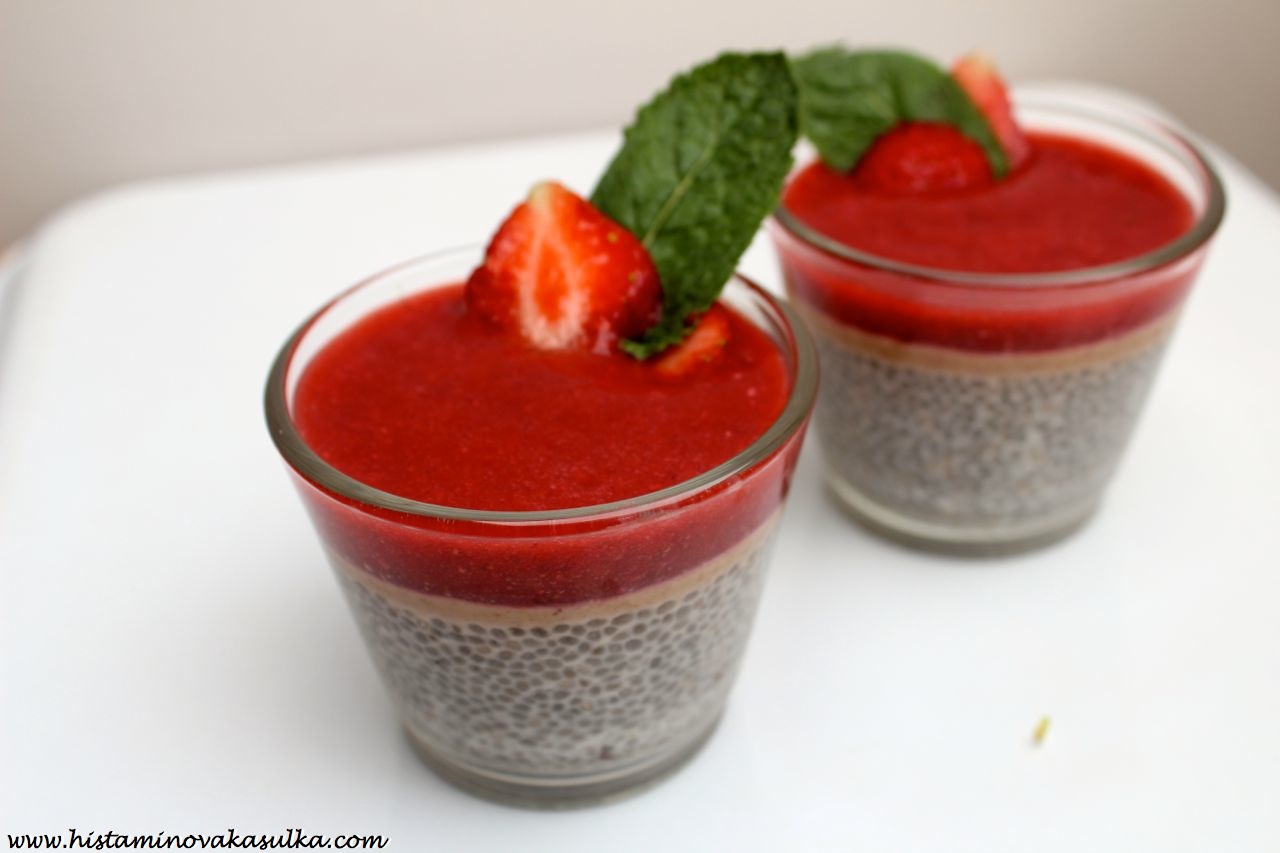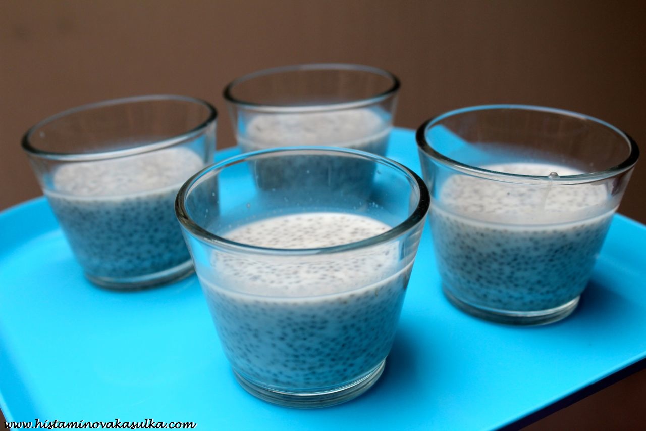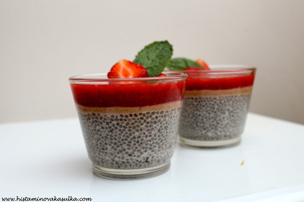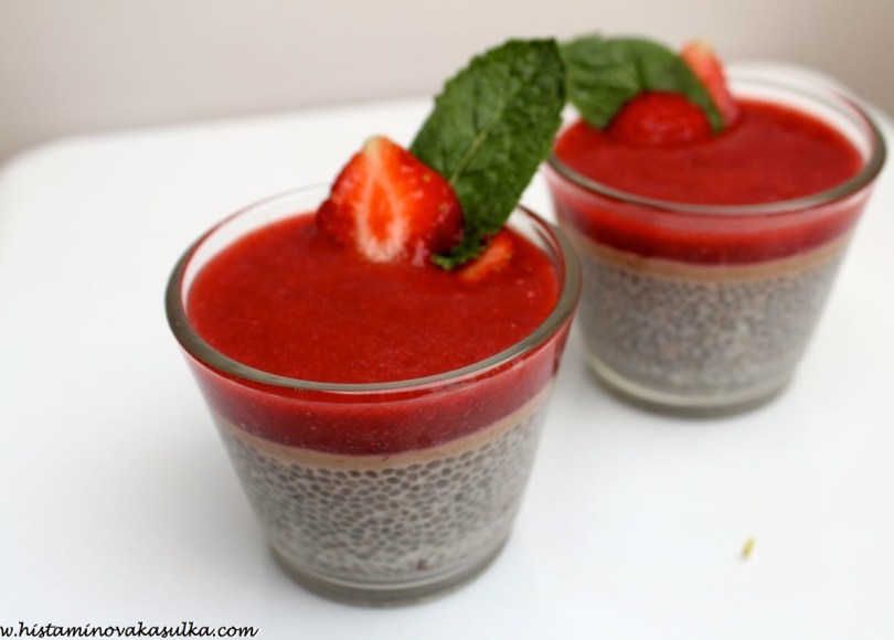 A jelikož je strašné vedro a u toho počítače člověk dlouho nevydrží, nebudu se zde dlouze rozepisovat a nebudeme ani dlouze mluvit. O chia pudingu dnes můžete vidět na spoustě stránek a já jsem se rozhodla konečně přidat do řad vyznavačů této lahodné nevařené dobrůtky. A bude bez lepku, mléčné bílkoviny i vajec. A můžete ji vlastně udělat z čehokoli, pokud tedy netolerujete jahody, rozmixujete ovoce, které vám zrovna vyhovuje a sedí (jahody jsou častým alergenem, ale samotné histamin neobsahují, působí jako histaminové liberátory, pokud jste tedy schopní jídlem stabilizovat své žírné buňky, můžete je klidně tolerovat, jen nedoporučuji sníst velké množství najednou). A kdo nemůže arašídové máslo, přidá jakékoli jiné oříškové či semínkové..anebo vlastně nemusí přidávat žádné (pokud nemáte vytipované, co tolerujete a co ne, tak raději zkuste před využitím v kombinaci s dalšími potenciálními alergeny). Mě prostě taková ta klasická americká chuť „džem a arašídové máslo“ mooooc chutná. A pokud vám chia zachutnají, na tomto blogu najdete spoustu lahodných receptů. Jen bych předem varovala, že jako každou potravinu i chia musíte nejdříve otestovat sami na sobě (byl popsán případ alergie, pozor tedy pokud reagujete na šalvěj, tymián, oregáno či mentol). Jedná se o pseudoobilninu a velmi často jsou jí připisovány schopnosti snižovat krevní tlak, což jsem si sama vyzkoušela. Pokud jej tedy máte tlak nižší, pouštějte se do experimentů ještě opatrněji. No a pokud vám ta semínka nějak nejdou přes pusu, vězte, že se u nás dostat také samotný chia olej! Ten využijete nejen k jídlu, ale také třeba pro výrobu domácí kosmetiky..o tom ale až někdy příště!