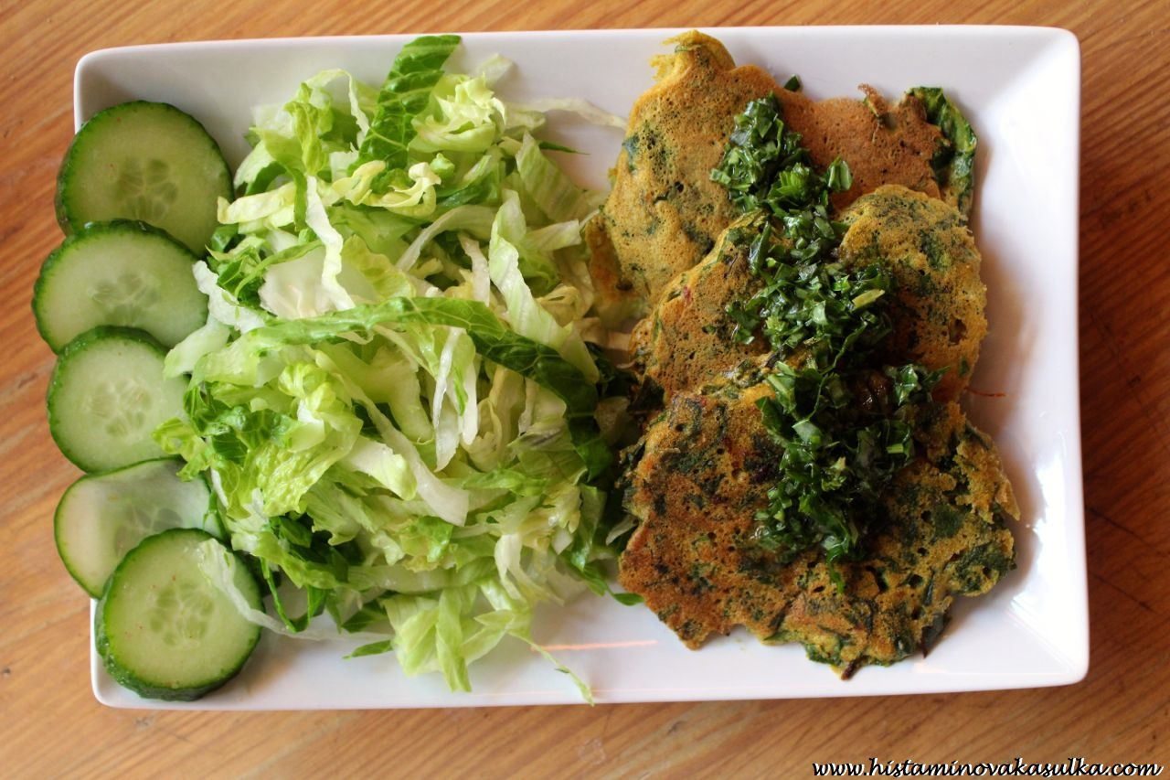 A že se mi doma ocitla nová plantainová mouka, která je plná vlákniny a minerálů a dokáže ochránit vaše játra, slinivku a regulovat krevní lipidy, rozhodla jsem se vyzkoušet přidat ji do placiček. Dostaneme tak kompletně bezobilné placky vhodné i pro odlehčenou dietu. Tentokrát přidáme obě zázračné zeleniny – kadeřávek a mangold (nebo můžete využít jen jednu, podle toho, co seženete nebo přežilo letošní vedra), přidáme protizánětlivou a protialergickou kurkumu (také pro krásnou žlutou barvu) a protizánětlivý a protialergický olivový olej.