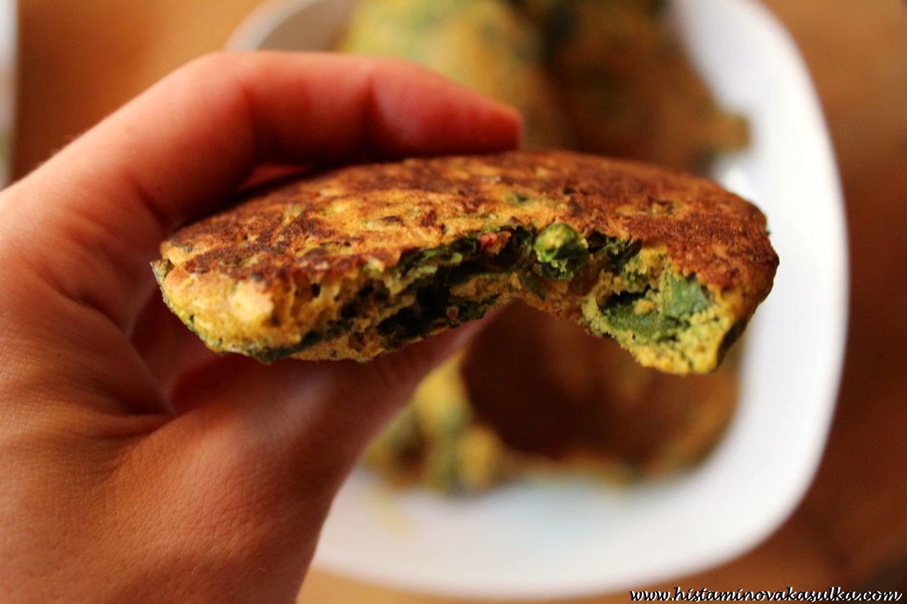 Kadeřávek a mangold odtrhneme od tuhých stonků a měkké listy nasekáme na drobno. Dáme do hrnce s trochou vody a podusíme 5 minut, zbytek vody slijeme a necháme vychladnout. Dva bílky oddělíme od zbytku vajec a vyšleháme je v pěnu. Smícháme plantainovou mouku se solí a kurkumou, vmícháme 2 celá vejce a 2 žloutky a olej. Opatrně vmícháme vyšlehané bílky a podušenou zeleninu. Lžící nabíráme hmotu a opékáme na pánvi z obou stran do zlatova. Používám keramickou pánev bez oleje a jde to velmi dobře.