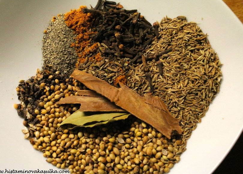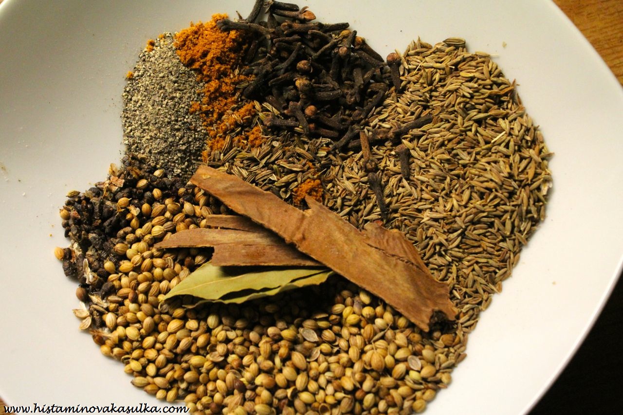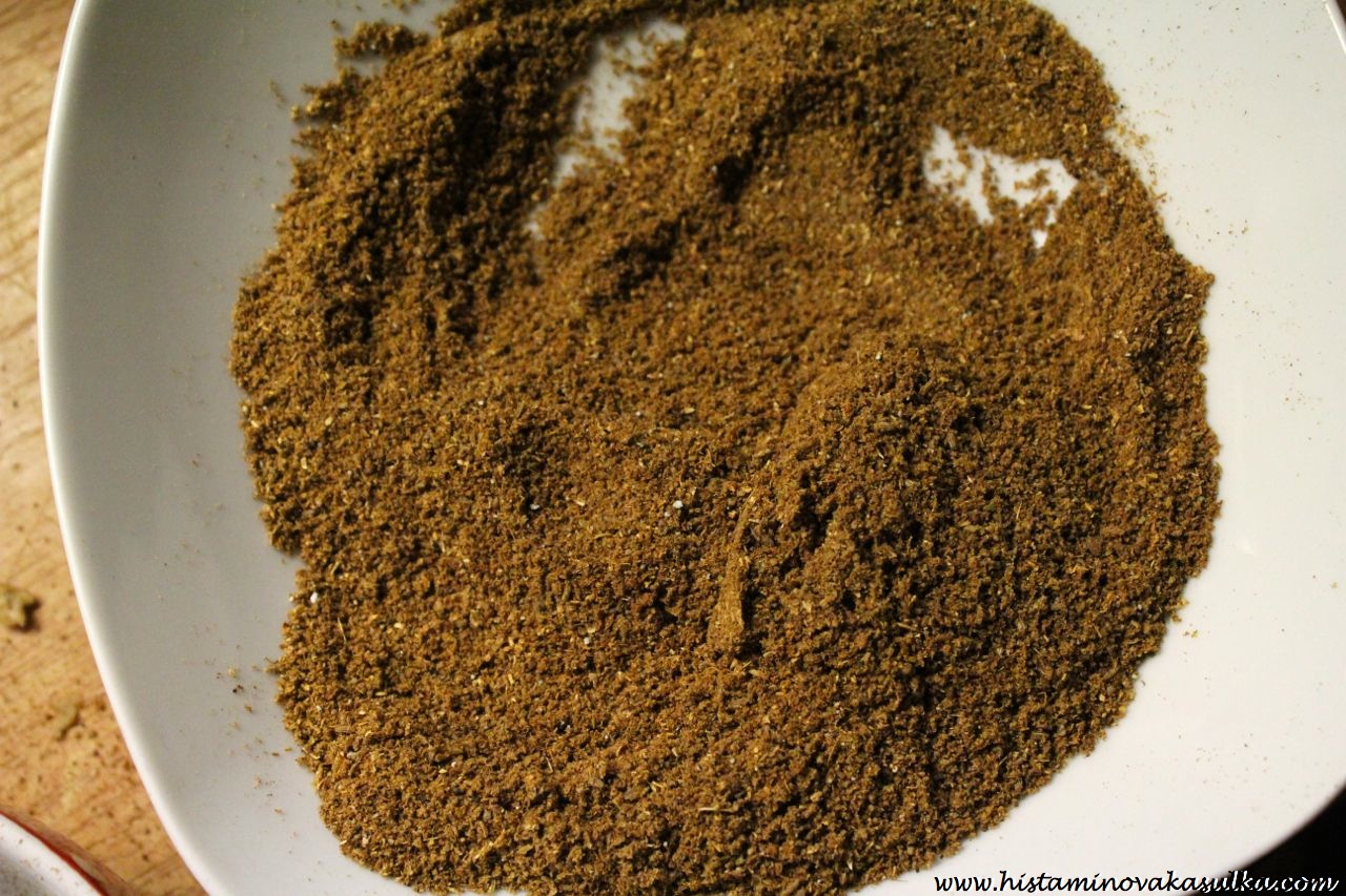 Rozpálila jsem keramickou pánev na sucho a 2-3 minutky opekla koriandrová semínka (jen tak krátce, aby se rozvonělo koření, nesmíte přetáhnout a spálit, jinak bude koření hořké). Stejně jsem opekla kardamom, římský kmín, směs fenyklu a anýzu a nakonec směs hřebíčku, skořice a bobkového listu. Já jsem pražila každé zvlášť, ale v podstatě spousta návodů říká opéct dohromady. Koření necháme dobře vychladnout. Směs naplníme do elektrického mlýnku (na kávu) a rozemeleme na jemné koření. Uskladníme v dobře uzavřené nádobě max. 6 měsíců. Pokud některé koření nemáte rádi, nevoní vám, či máte alergii, tak jej prostě vynechejte. Ono se tolik nestane:)))