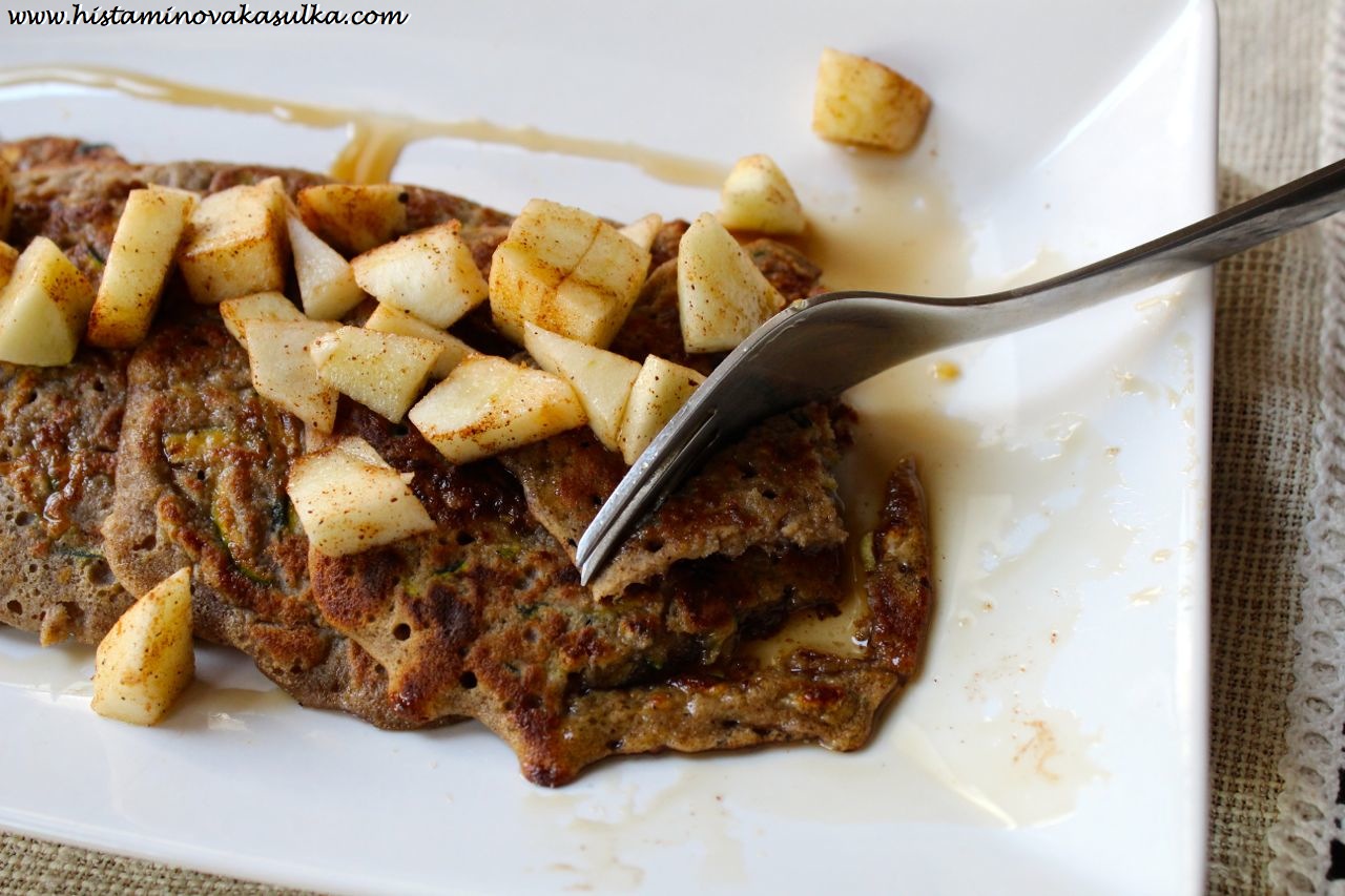 Cuketu a jablko nastrouháme na hrubo. Smícháme mouky s cukrem, solí, sodou a skořicí. Zvlášť vyšleháme tvaroh s hrnkem vody, vejci a octem. Vmícháme suchou směs do mokré a nakonec vmícháme nastrouhanou cuketu a jablko. Necháme 5 minut odstát a lžící nabíráme těsto na rozpálenou pánev. Osmažíme z obou stran dozlatova (keramická pánev úplně bez oleje). Podáváme ideálně polité javorovým sirupem a s nakrájenými jablky obalenými ve skořici. Dobrou chuť.