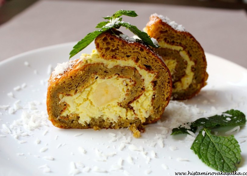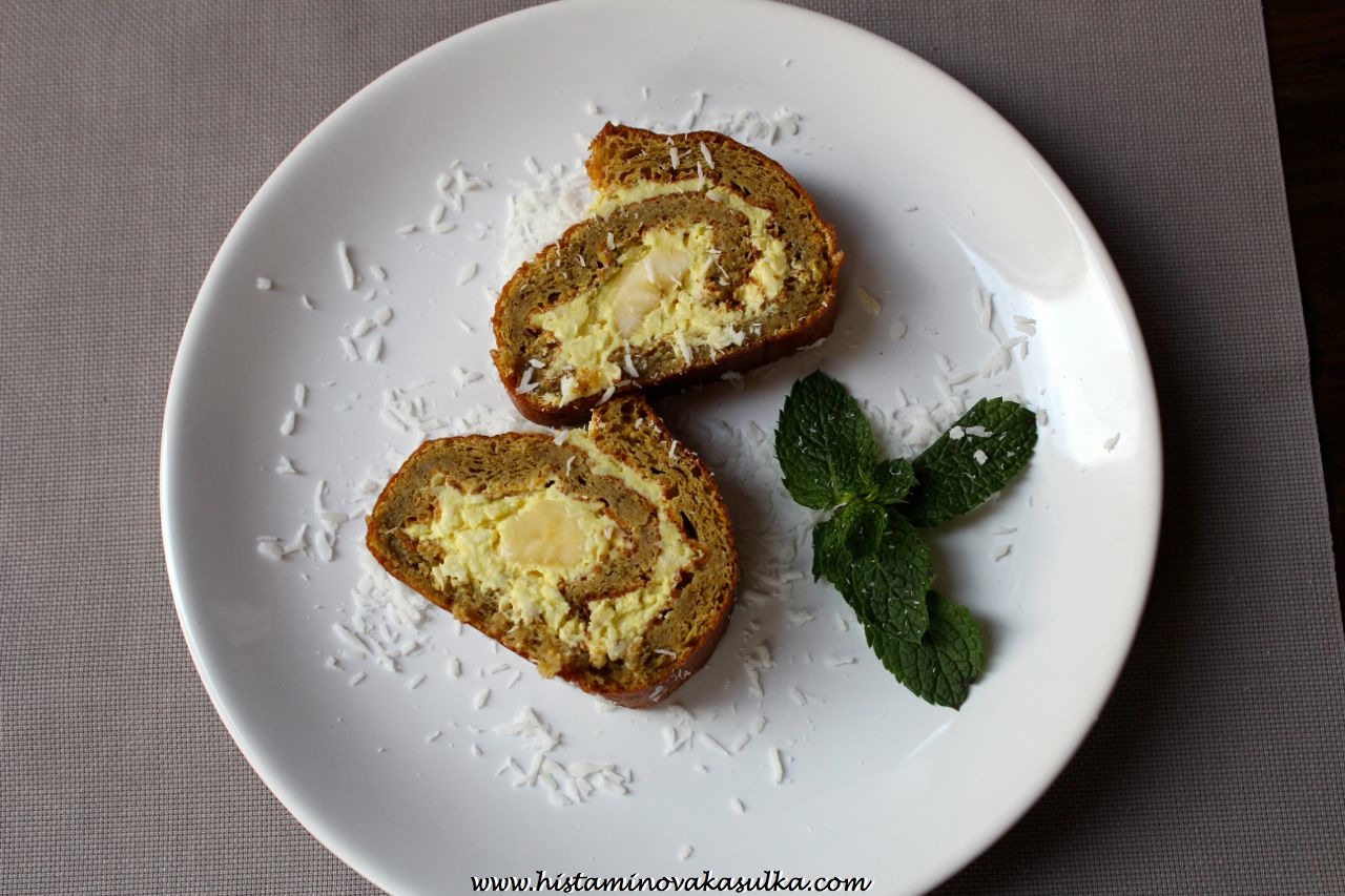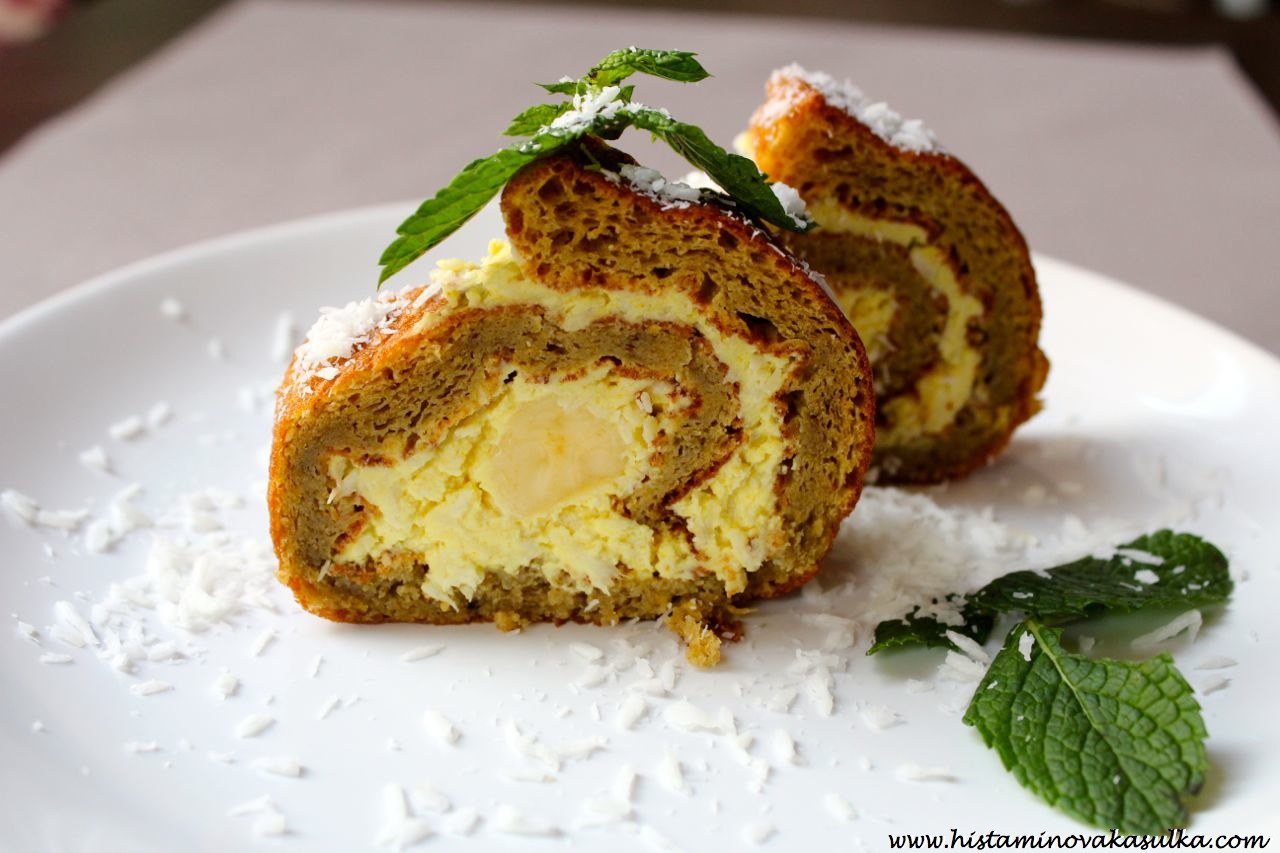 Aby se nám dezert trochu zažlutil, použila jsem špetku kurkumy. Toto koření je nejen protialergické a protizánětlivé, ale také krásně obarví cokoliv do žluta (i když si to zrovna nepřejete). A stačí opravdu špetka, takže chuťově nic nepoznáte! Kokos je navíc protizánětlivý, takže dodá jídlu ještě trochu toho výživového šmrncu. Navíc díky banánové mouce je roláda ihned krásně měkučká, takže ji můžete spáchat i pro návštěvy, které se ohlásily na poslední chvíli. Tak šup, na co ještě čekáte?