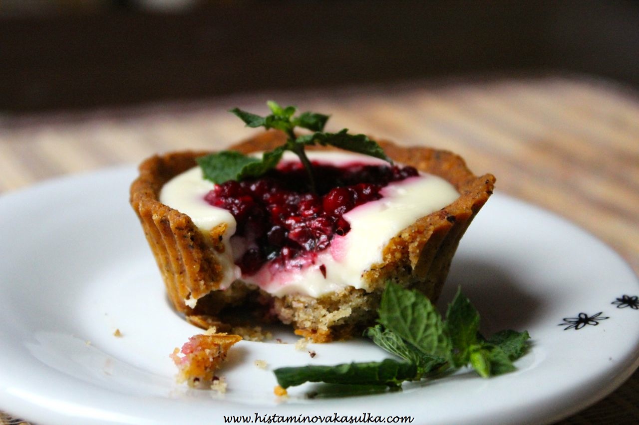 Košíčky jsou samozřejmě bezlepkové. Zkoušela jsem dvě verze – první z pudrové rýžové mouky a druhé z kombinace hladké čirokové a hladké rýžové mouky. V druhém případě chutnají trochu více jako vánoční pracny, ale možná to bylo také kvalitou lískových ořechů (které jsem předem namáčela a pak nechala vysušit, jsou pak výraznější, ale přitom bezpečnější). Na krém vám postačí dvě ingredience – kvalitní bílá čokoláda (která neobsahuje kakao, kakaové máslo je pouze tuk, který nenese histaminové liberátory, ale pozor na složení a obsah cukr a nekvalitního tuku) a dobré mascarpone. A pak už budete potřebovat jen trochu ovoce, protizánětlivou a protialergickou mátu a trochu kokosového cukru. To je cukr, který se získává nasušením kokosového nektaru a přestože je to stále jen sladidlo, uchovává si svou celistvost a obsah dalších látek. Je prostě krapet zdravější (a chuťově lahodný).