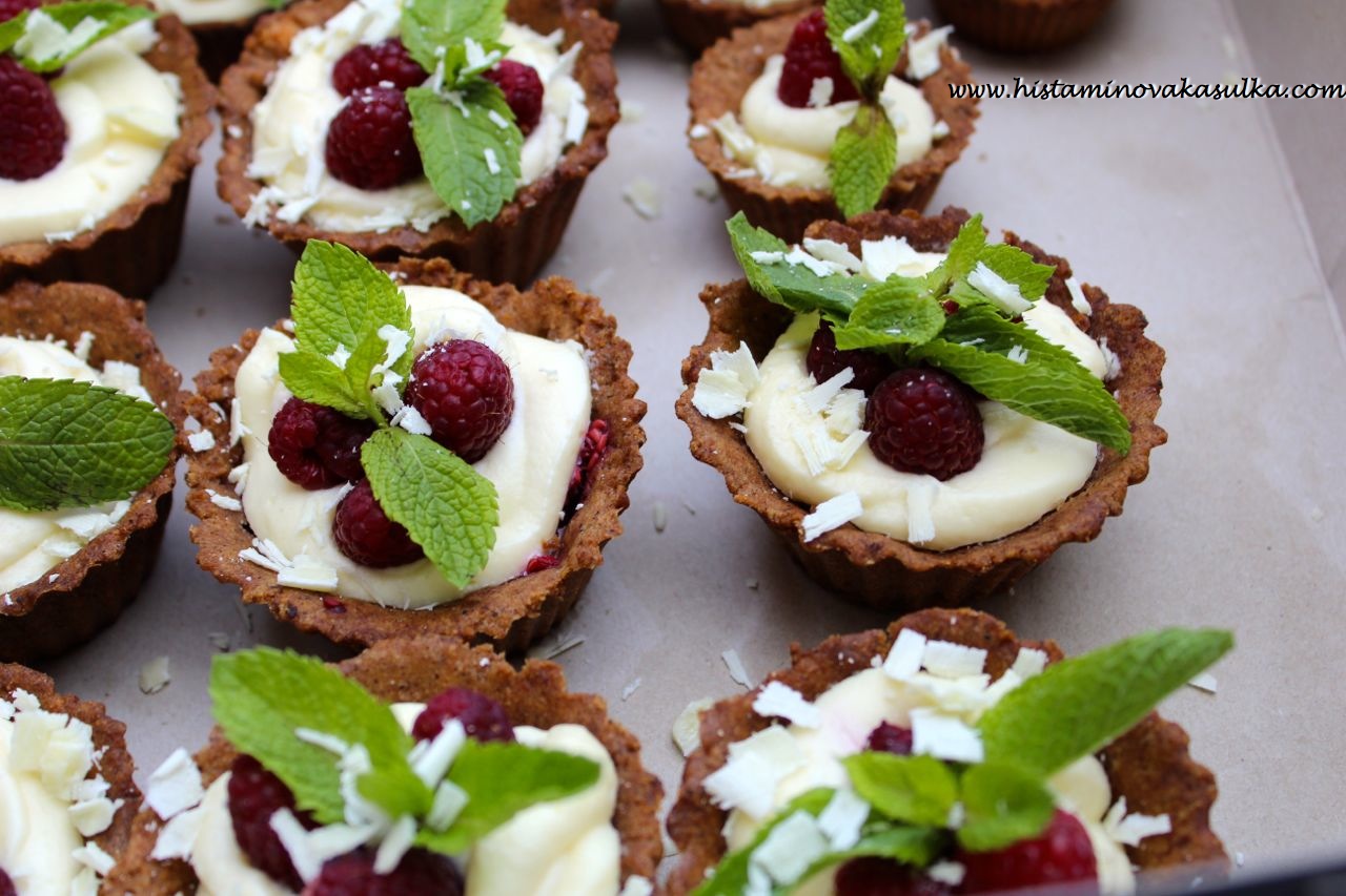 Ořechové košíčky s mascrapone krémem s bílou čokoládou a malinami