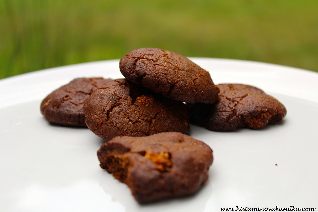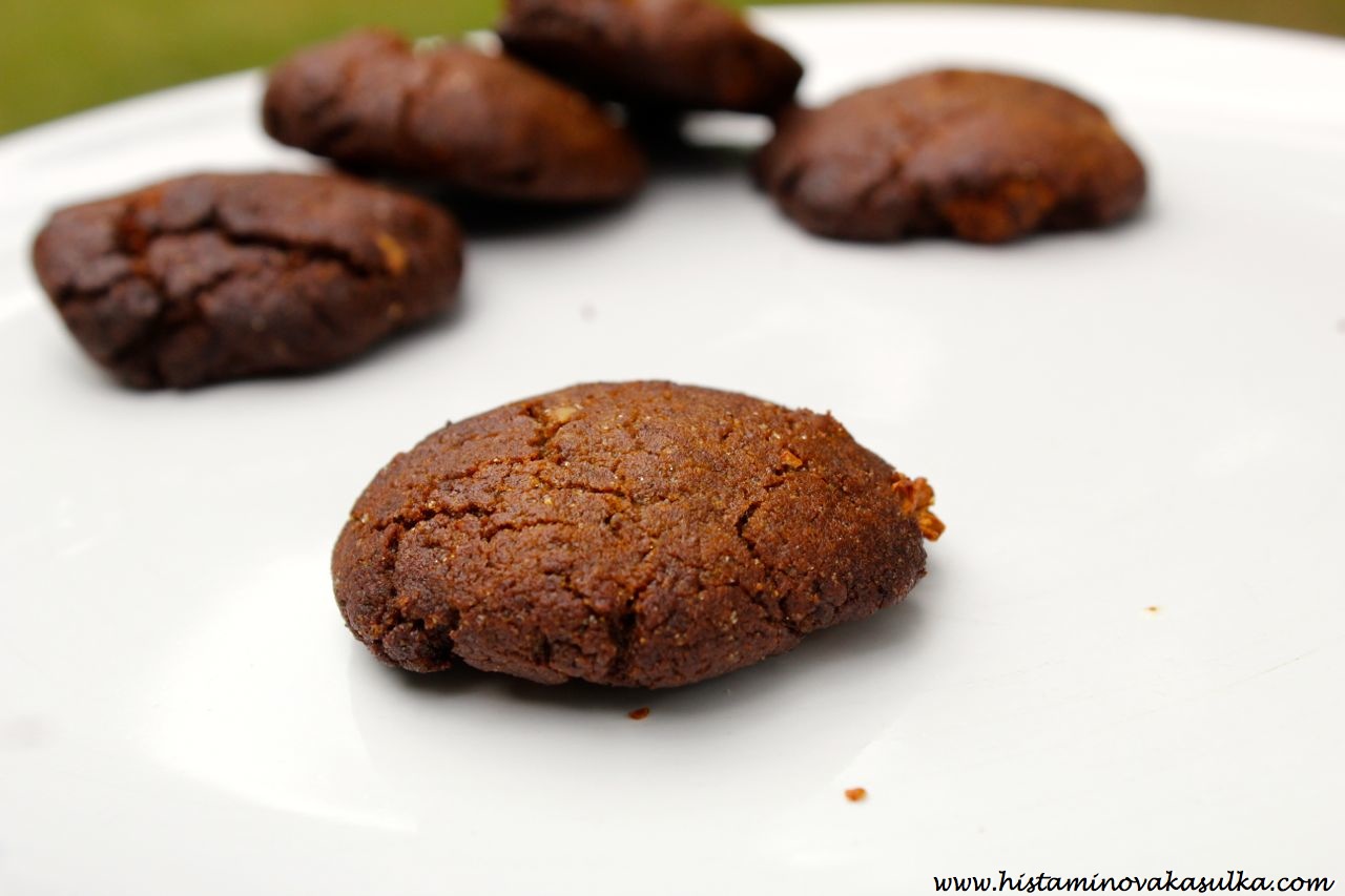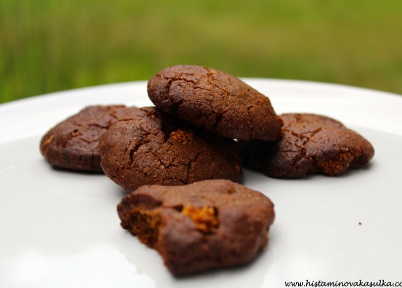 Každopádně sušenky jsou vždy moje první volba. Jsou na kousky, takže nepotřebujete nůž, jsou do ruky, takže nepotřebujete příliš prostoru jednu rychle zhltnout a dokáží přežít i divy. Tedy né všechny, třeba tyhle banánové by se při letních teplotách a své na-jazyku-se-rozplývající konzistenci velmi rychle „spekly“ dohromady. Tak jsem hledala nějak, které budou nejen „pevnější“, ale ideálně bez všech větších alergenů, aby přežily i pár dní venku a neutvořilo se v nich moc dalšího histaminu. A v tuto chvíli přichází na scénu – ano, cizrnová mouka. Trochu se zde potýkáme s problematikou lektinů a antinutričních látek, ale to lehce vyřešíte, pokud si doma sami mouku připravíte z uvařené a znovu vysušené cizrny. Pokud to však není váš problém a na sušenky spěcháte, dá se pořídit jemná cizrnová mouka. Pokud chcete sušenky krapet více měkké, můžete panelu nahradit medem, který pak udělá svoje „změkčovací“ kouzlo. Ale pokud sušenky uzavřete do neprodyšného pytlíku, změknou vám trochu také, pokud je necháte v mističce, zůstanou krásně křupavé jako cookies. Tmavou barvu jim dodává pouze melasa, takže je skvěle využijí i alergici na kakao, neobsahují ani žádné ořechy, ale můžete do nich kousky přidat. Sušenky mají díky melase krásně karamelovou chuť. A také krom kousku proteinu obsahují hořčík, vápník, B6, B1, folát, železo i vitamín E.