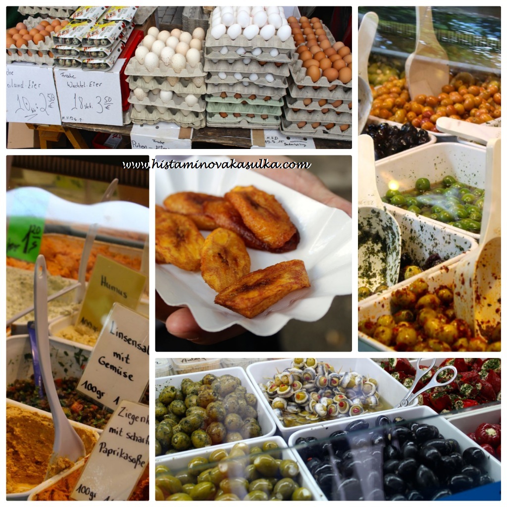 Pokud se dostanete do Berlína v úterý nebo pátek a milujete čerstvé ovoce a zeleninu, musíte prostě zajít na místní turecký trh na ulici Maybachufer (ideálně z U-bahn Schönleinstraße nebo prostě pěšky na cestě z Kreuzbergu). Ono je v Berlíně o chlup (možná dva) dráže než v ČR, takže budete z cen na tržišti mile překvapeni. Co je ale důležitější, můžete si dát čerstvé mango, avokádo (kdo toleruje), skvělé bio banány za pakatel i krásné broskve a spousty zeleniny. A jelikož já a ovoce a bylinky a zelenina jsme velcí kámoši a před samotnou cestou jsem jedle jen ovoce a zeleninu, abych nezačínala pobyt nepříjemnými událostmi v koupelně (můj „pohotovostní“ režim), tak jsem se hned pěkně nadlábla (mají tam spoustu ochutnávek) a přinesla si spoustu ovoce na další dny na snídaně:). Pokud si mám volit mezi kouskem koláče nebo plnou mísou ovoce za stejnou cenu, mám naprosto jasno.