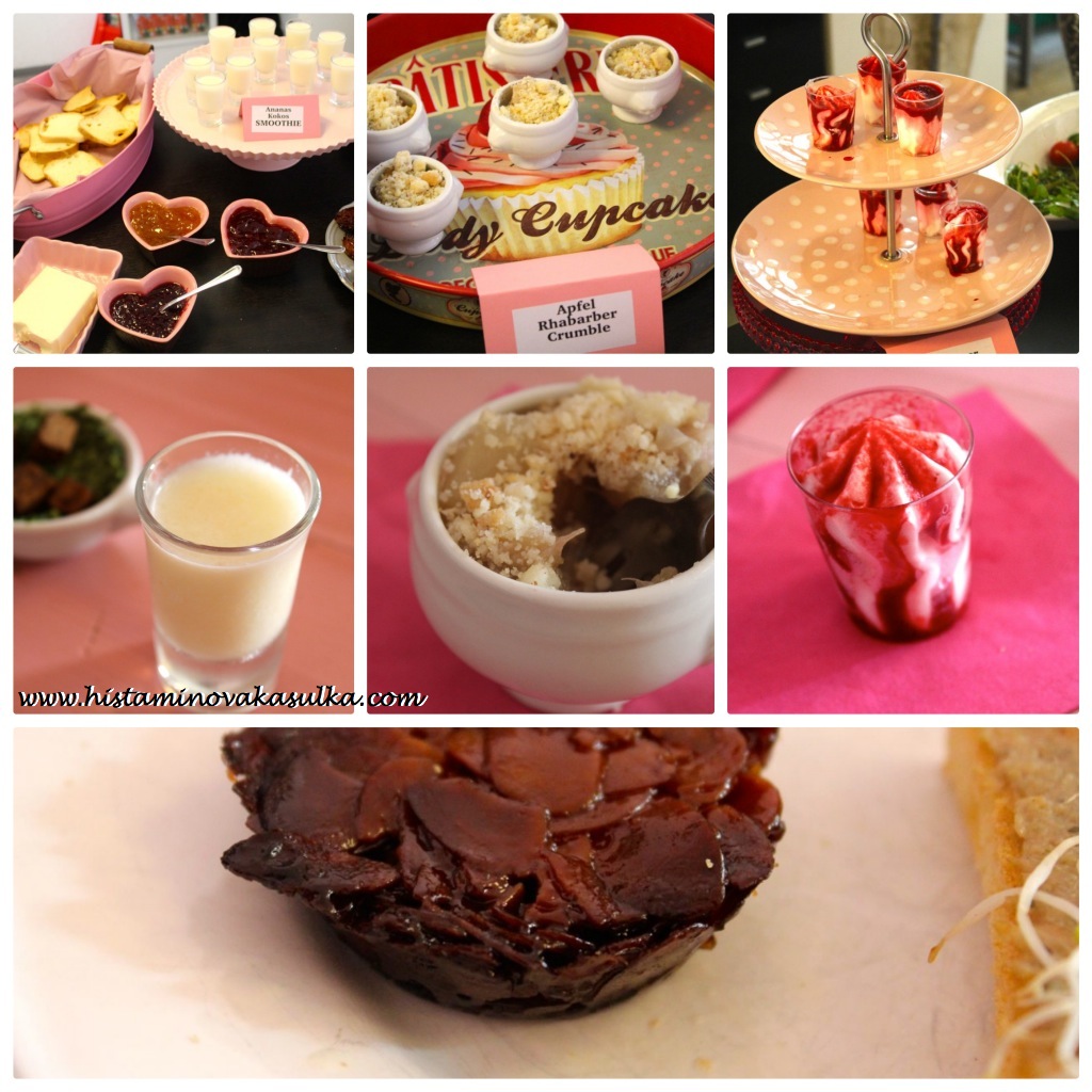 Moc se mi líbilo i servírování. Jednak je tedy k dispozici na sucho opečený bezlepkový chléb (řekla bych, že Schär), veganské máslo a několik druhů marmelády. Z teplého bufetu jste si mohli dát výborné thajské nudle, cuketu v bazalkovo-limetkové omáčce, marockou cizrnu (ta byla se sójovým masem, celkově to asi alergici na sóju budou mít komplikované a v Ohlala moc na výběr nebude) a ještě jednu směs, co už si nepamatuji. Cuketa byla vynikající, křupavá, nudle lehce pikantní, výborná kombinace kari a kokosového mléka. Pak jste také mohli vybrat ze tří různých salátů (2 byly bez rajčat, ale jeden byl s balzamikem), dát si topinky s „paštikou“, plněné papriky či třeba špenát „se špekem“.