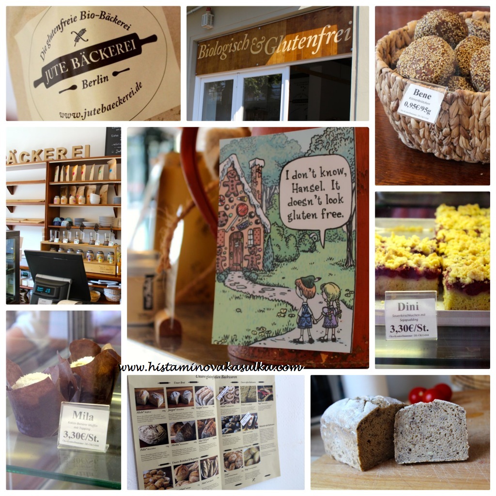 Teď už k tomu, co zajímá asi většinu normálních celiaků. No přiznám se, byť pečivo nevyhledávám, byla jsem prostě zvědavá. Jako pekárna s komplet nabídkou nejen v bezlepkové, ale i bio formě, to je výzva. Jute Bäckerei je velmi hezká kavárnička s pekárničkou (či vlastně naopak) kousek od Mauerparku (kam v neděli prostě musíte zajít), jen v neděli před zavíračkou už moc na výběr neměli. Tak jsme zkusili vzít Jürgen (0,5 kg za 4,80 eur), který je semínkový, a musím říct, že se jim povedl. Není moc nadýchaný, spíš takový hutnější a přežil i cestu zpět do ČR:)). Jinak lístek se složením v angličtině mají na vyžádání.