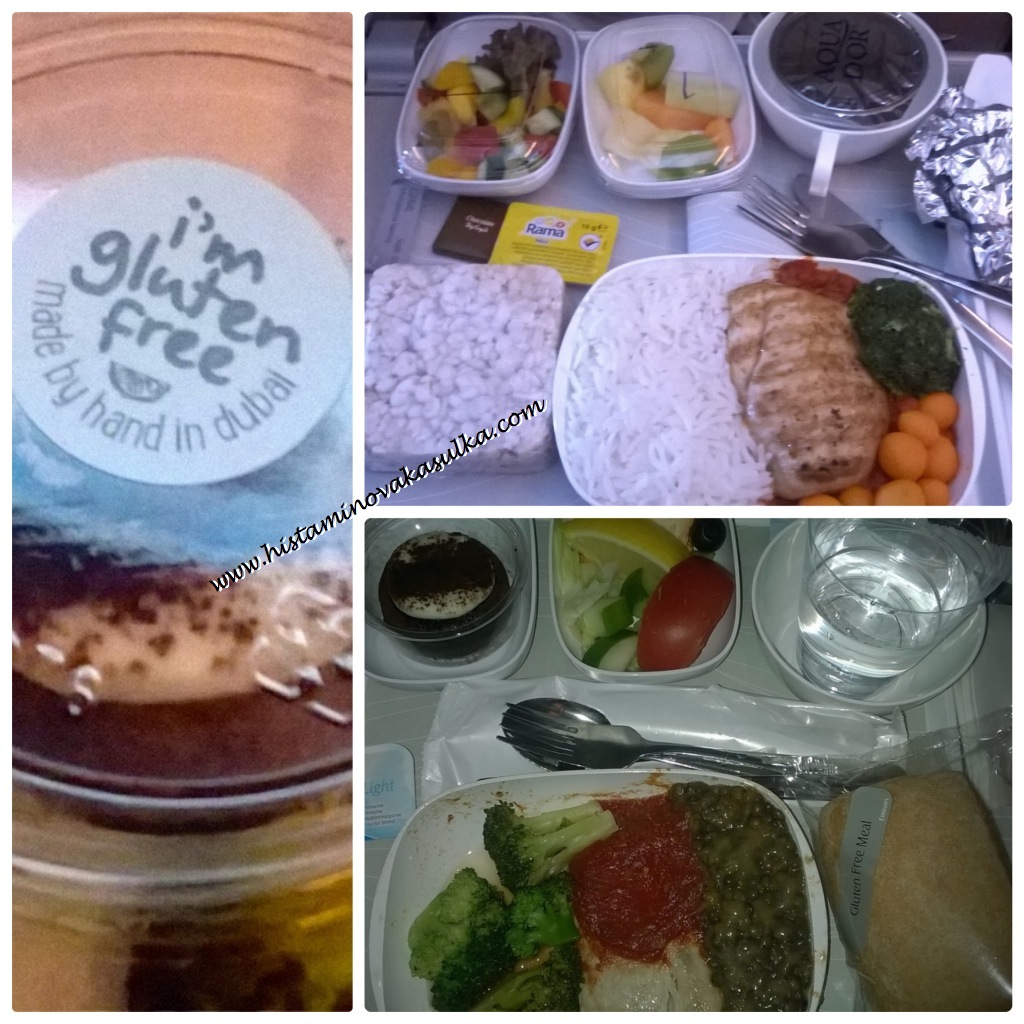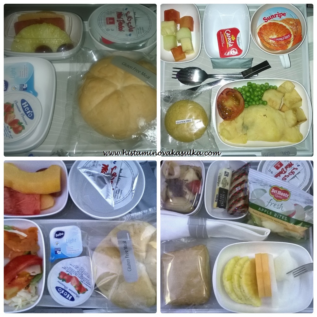 Pokud se tedy i tak rozhodnete do cesty pustit, můžete se trochu inspirovat u mne. Pokud máte problémy s lepkem a ještě histaminovou intoleranci, doporučuji si začít tím, že si nabalíte jídlo do letadla a nějaký mls po příletu. Já osobně vždy cestuji s nějakými raw tyčinkami (ideálně s obsahem proteinu) a sušeným ovocem/ořechy, abych byla schopná pokrýt nutnou potřebu živin a kalorií. Jinak peču bezlepkové sušenky či housky z blogu Veselé Borůvky, o kterých jsem se už mockrát zmiňovala. Obojí totiž vydrží nejen cestu, ale i pár dní po příletu. Většina společností vám sice nabídne bezlepkové menu, ale počítejte s tím, že vždy bude něco vymáchaného v rajčatech, bude ryba, margarín (proč, opět se ptám proč) a v ovoci nějaký ten ananas. Bezlepkové vegetariánsk menu pro jistotu neexistuje (protože podusit čočku a brokolici a servírovat to s rýží je děsný problém). A taky se může stát, že posádka (ať žijí Emirates a jejich vysokoceněný servis) klidně ztratí váš bezlepkový oběd (ano, na cestě z Dubaje se jim to povedlo) a nabídnou vám místo toho tzv. ovocný talíř, kde je vše lepkové až na pár plátků ovoce (z čehož polovinu tvoří ananas, dezert je vymáchán v nějaké kakaové omáčce).